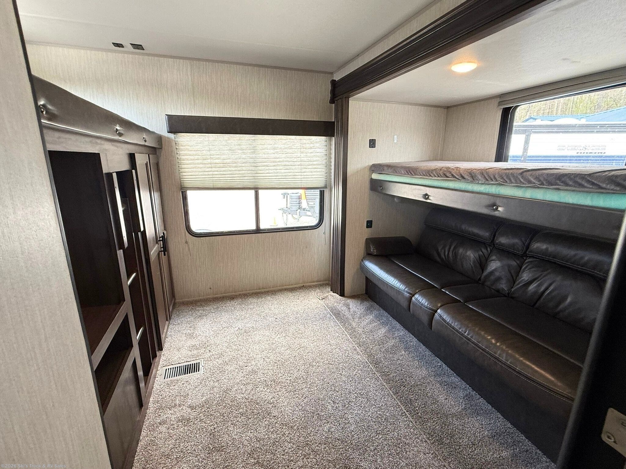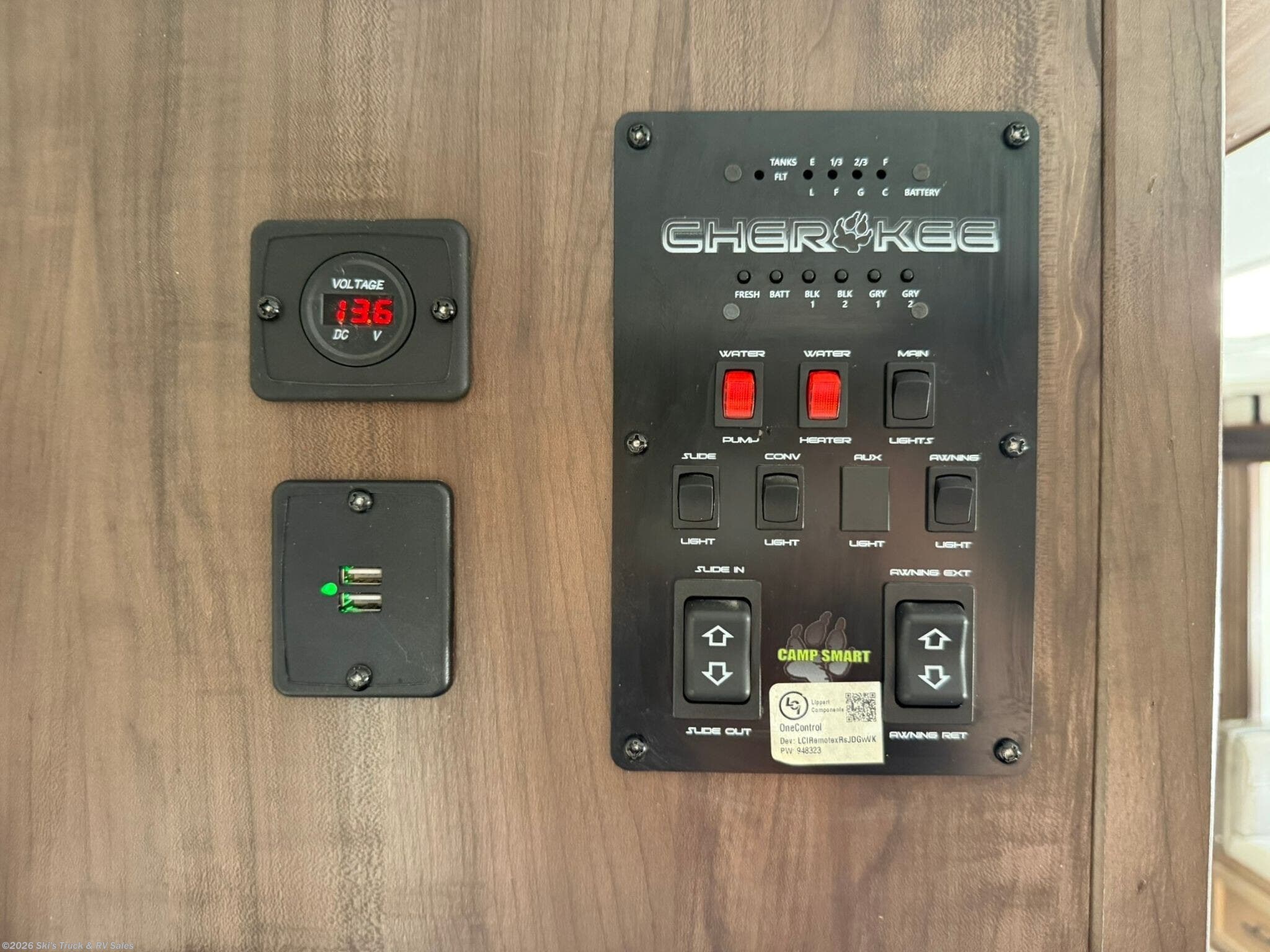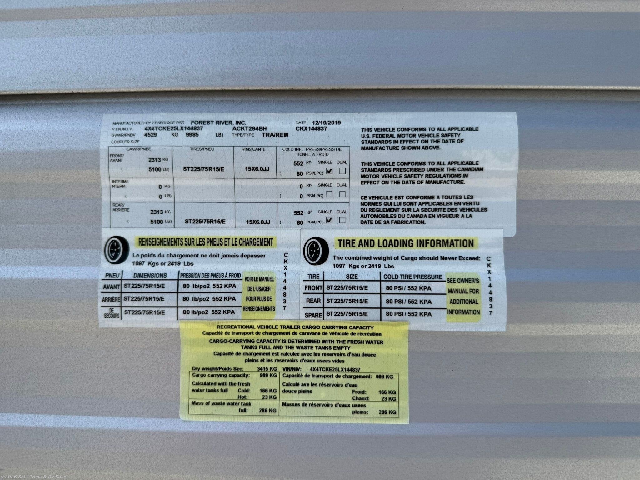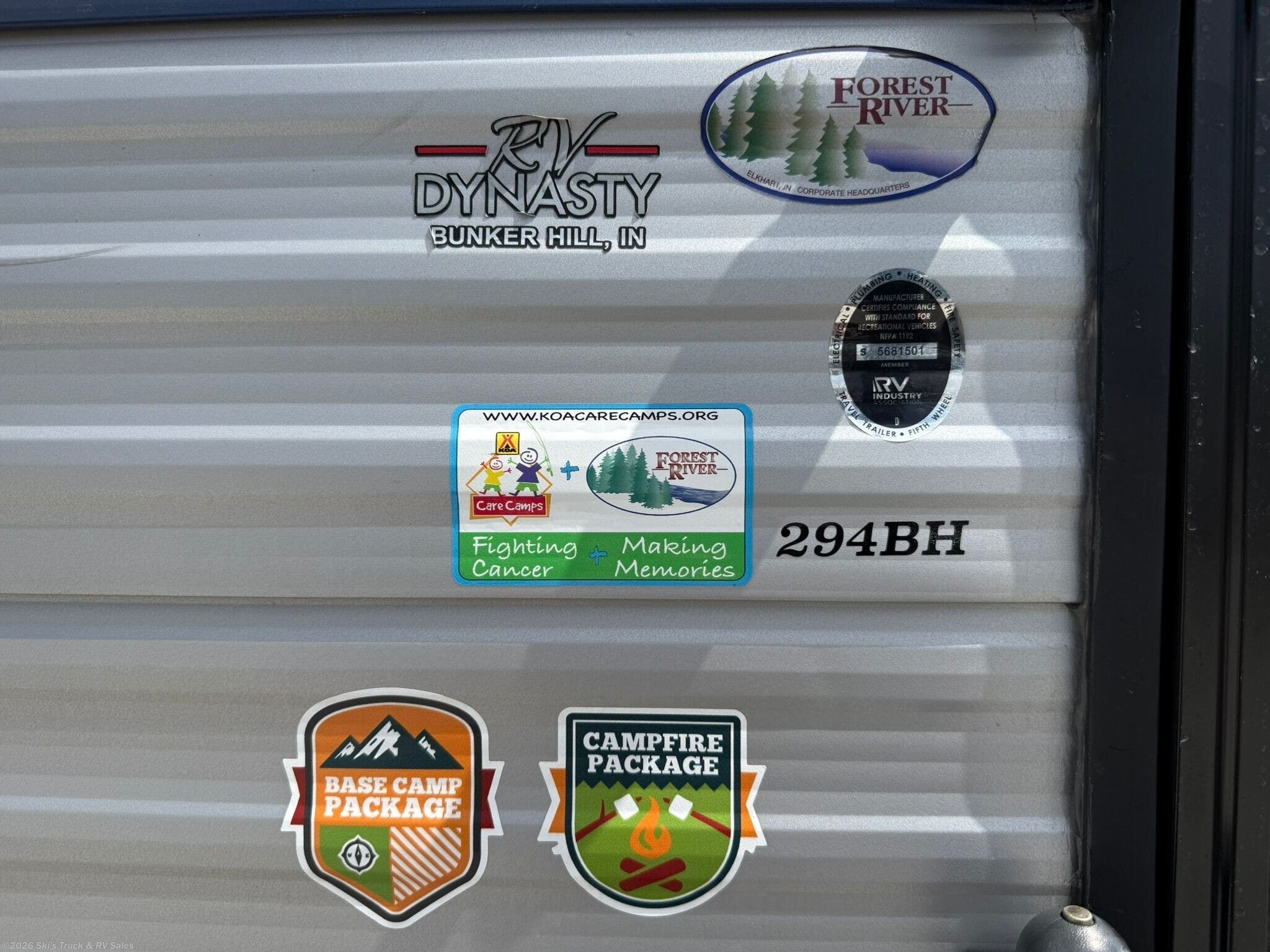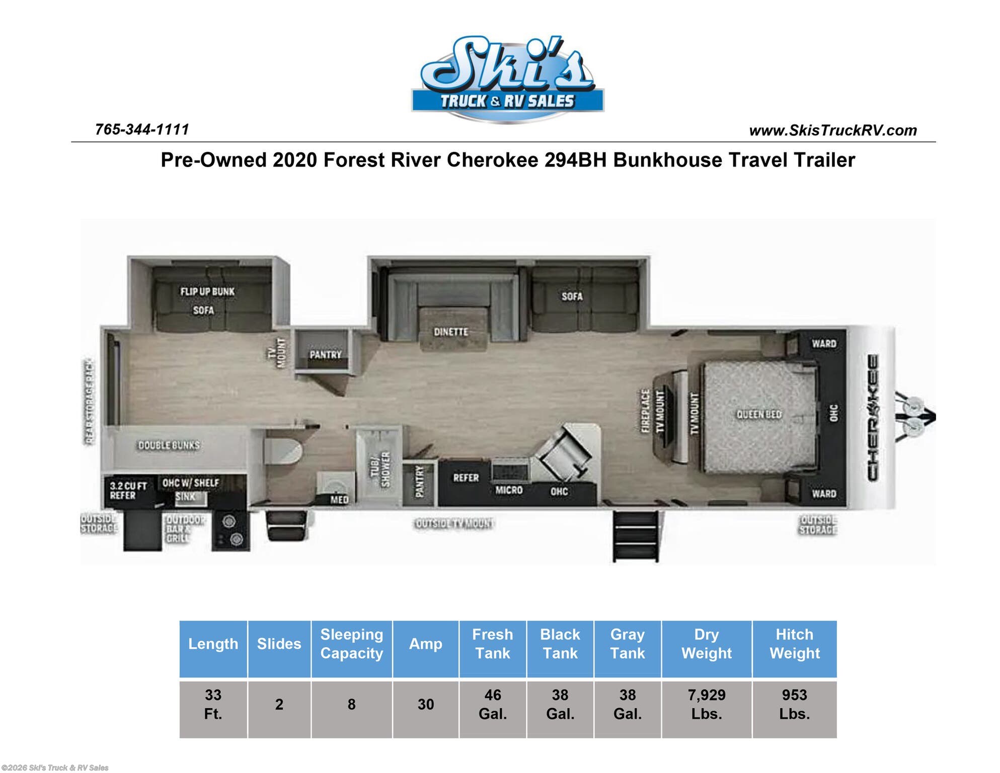 Pre-Owned 2020 Forest River Cherokee 294BH Bunkhouse Travel Trailer; 33 Foot; 2 Slides with Toppers; Sleeps 8; Hitch Weight: 953 Lbs.; Dry Weight: 7929 Lbs.; 30 Amp; Power Tongue Jacks; Manual Stabilizer Jacks; 46 Gal. Fresh Water Cap.; 38 Gal. Black Water Cap.; 38 Gal. Gray Water Cap.; Two 20 Lbs. Propane Tanks; 13,500 BTU AC; 30,000 BTU Furnace; 10 C. F. (110V) Refrigerator; 6 Gal. Gas/Elec. Water Heater; Microwave; 3-Burner Stove/Oven; Three TV Jacks; AM/FM; Speakers; One Fireplace; Pantry; Stainless Steel Sink; U Shaped Dinette; Jack-knife Sofa; Queen Bed; Single Bunks; One Bathroom with Shower/Tub; 15 Foot Power Awning with LED Lights; Solar Package; Outside Kitchen; Outside Shower; Exterior Storage; Foldup Steps; Grab Handle; Exterior: Few Small Scratches in Lower Metal (Price Reflects This); Battery Disconnect; Black Tank Flush; Climate Package; Tinted Windows; Zebra Shades; Spare Tire; Trade In Unit; Financing Available; Nice Pre-Owned Bunkhouse Travel Trailer for the Price: $19,995. Call Skis Truck & RV Sales at 765-344-1111 or visit us at for more information.