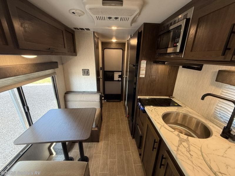 This unique rear entry allows you to set up at the campsite with a view as you walk outside each morning. You can relax under the power awning before going fishing or taking a walk around the lake. When you get hungry, the cooktop and microwave allow you to make hot meals and you can store your drinks in the 10 cu. ft. refrigerator. Have a seat at the dinette for meals or playing games, and offer an overnight guest a place to sleep. The queen bed up front allows you to sleep on your own bedding each night with overhead cabinets for your clothing and a shelf to set your cell phone and keys on. And the split bath offers a private toilet room, and a private shower on the opposite side so two people can get ready at once.