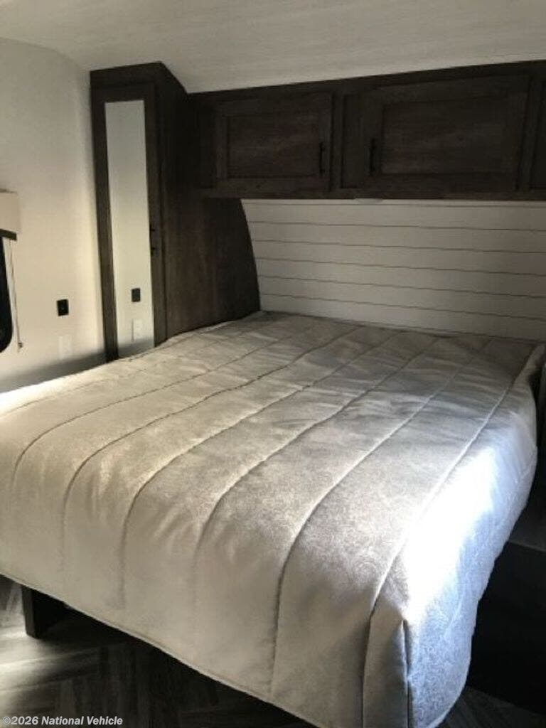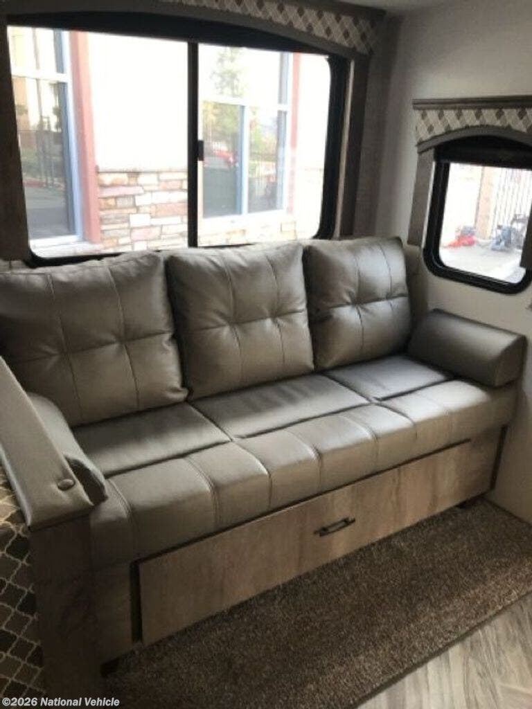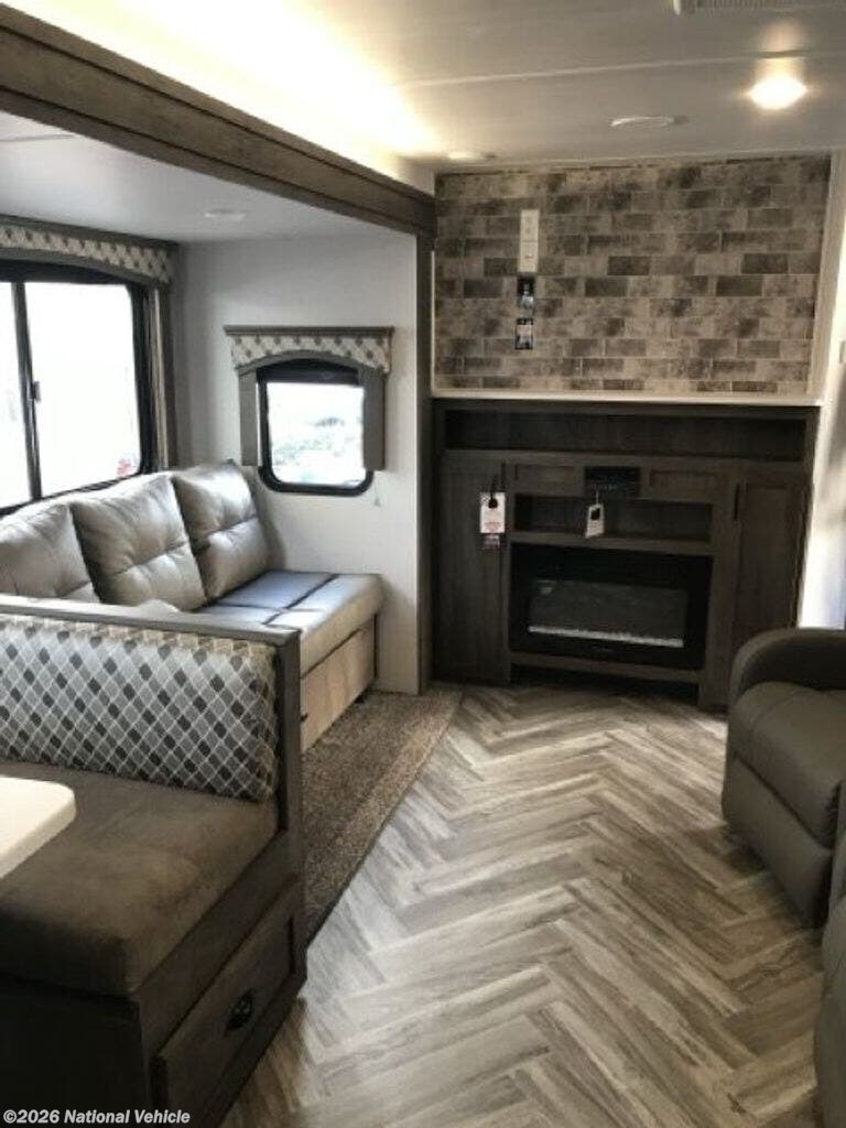 From the moment you step inside, you?re greeted by a bright, open living space with residential touches throughout. The spacious slide-out houses a comfortable U-shaped dinette ? perfect for meals, game nights, or converting into extra sleeping space ? along with plush seating positioned for the entertainment center and cozy fireplace. Large windows flood the interior with natural light, creating an airy, inviting atmosphere.