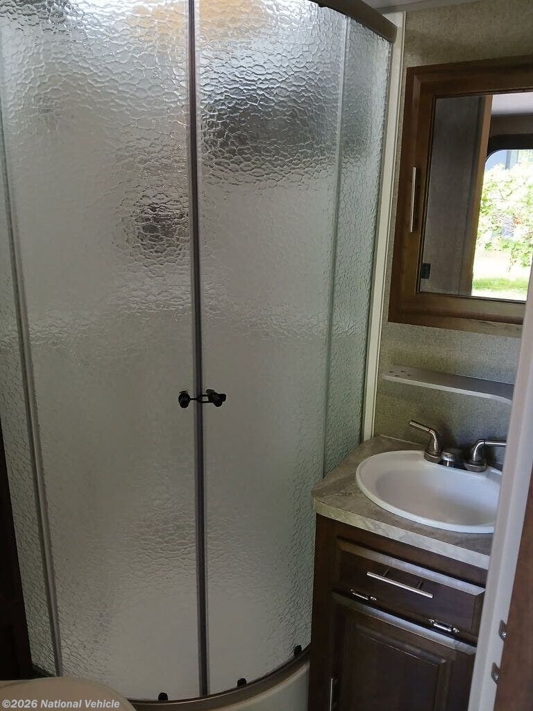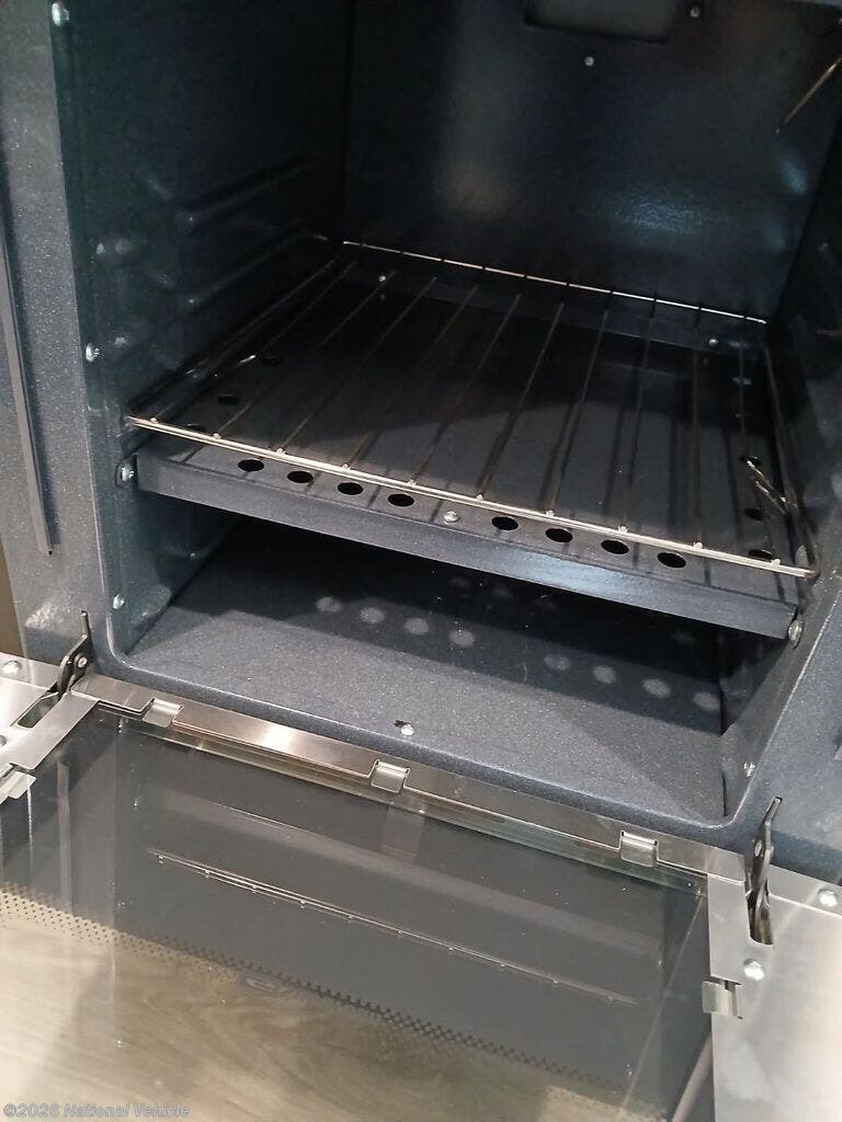 The fully equipped kitchen is a culinary haven, boasting stainless steel appliances, a deep undermount sink, and generous prep space-ideal for preparing meals on the road. The rear bath provides a spa-like experience with a glass-enclosed shower, vanity, and premium fixtures.