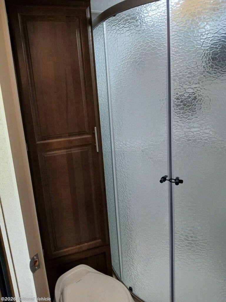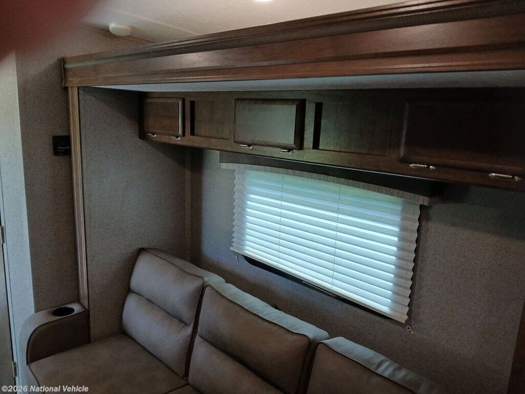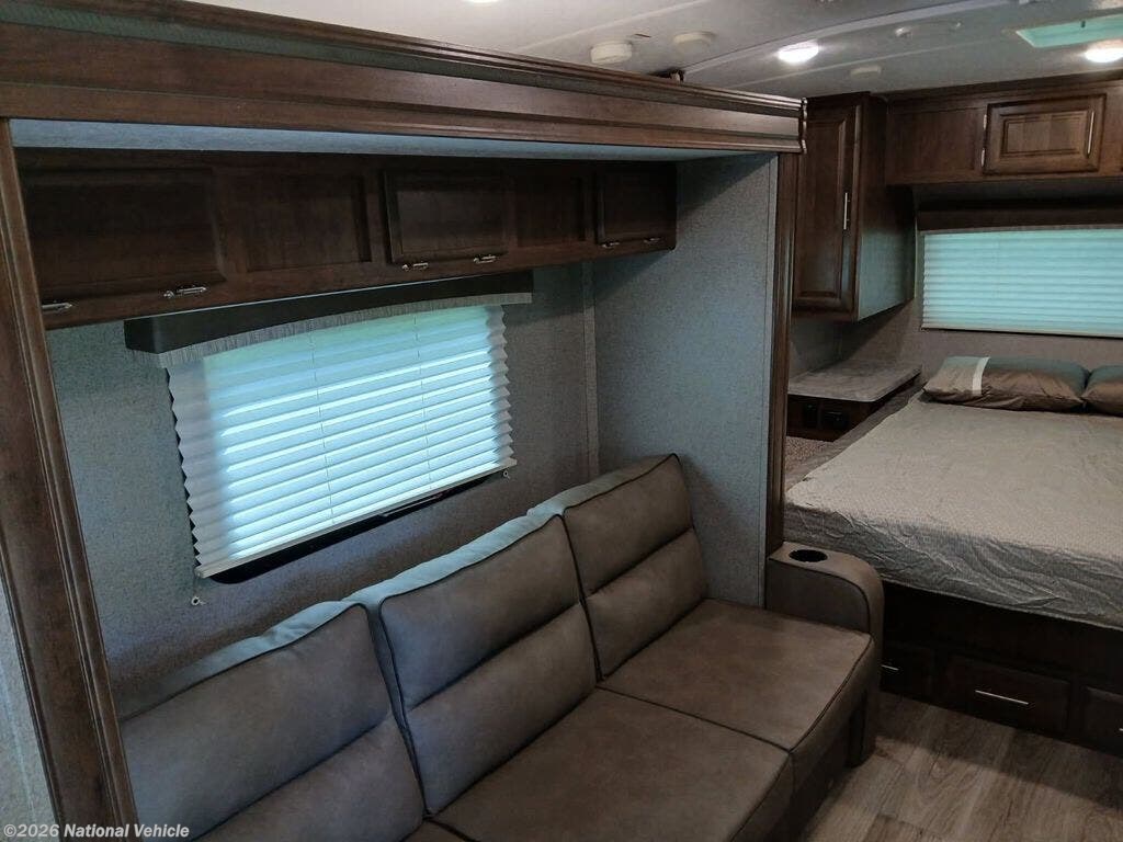 Step inside to a thoughtfully appointed interior featuring rich cabinetry, elegant solid-surface countertops, and residential-style flooring that exudes modern sophistication. The spacious front queen heated bedroom offers a serene retreat with ample storage, while the slide-out expands the living area to create an open, inviting atmosphere. Relax in plush seating as natural light pours through panoramic windows, or enjoy your favorite entertainment on the integrated media system.