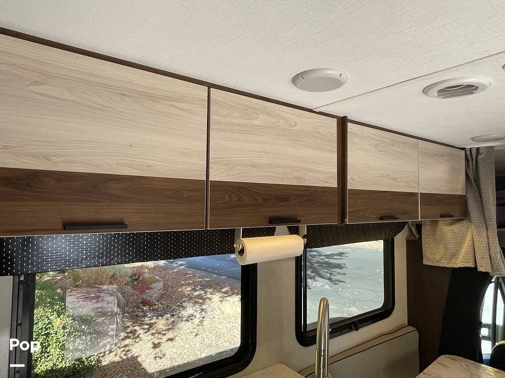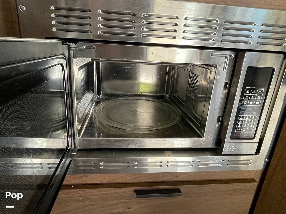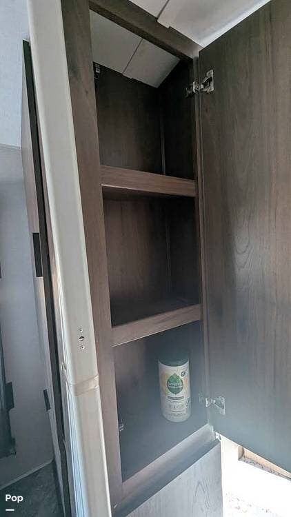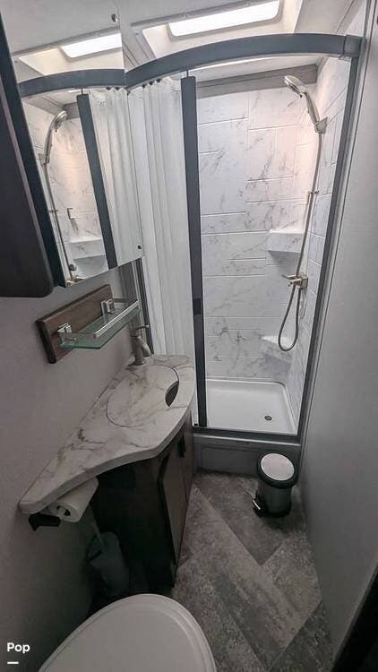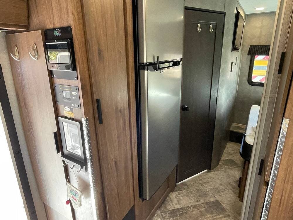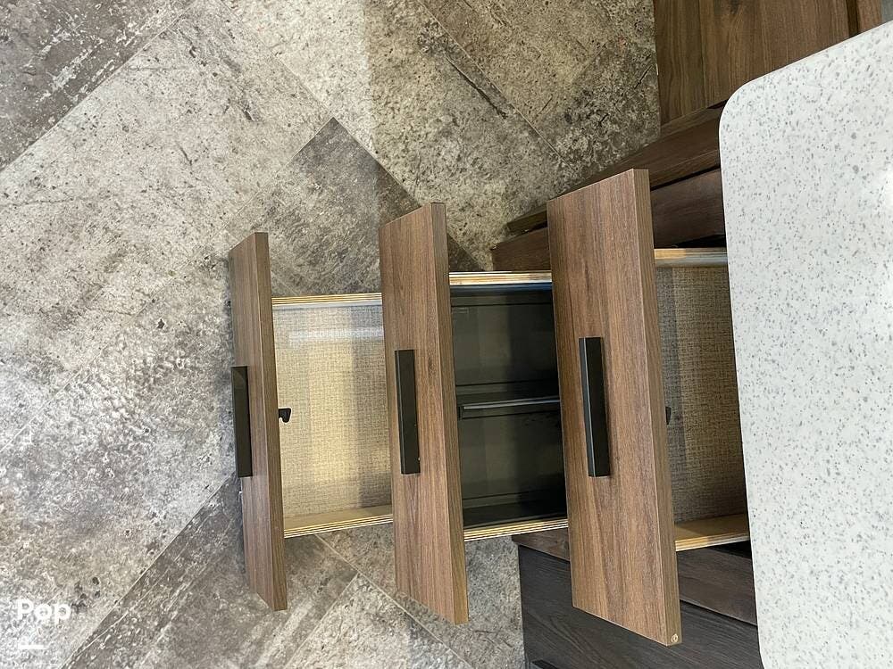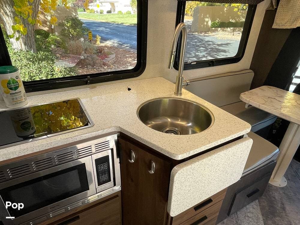 Step inside and you'll find a beautifully designed interior with high-end finishes, modern dcor, and thoughtful details throughout. The open floorplan features a slide-out with a comfortable queen bed, a spacious dinette that converts into an additional sleeping area, and a fully equipped kitchen with solid-surface countertops, stainless-steel sink, convection microwave, and abundant storage.