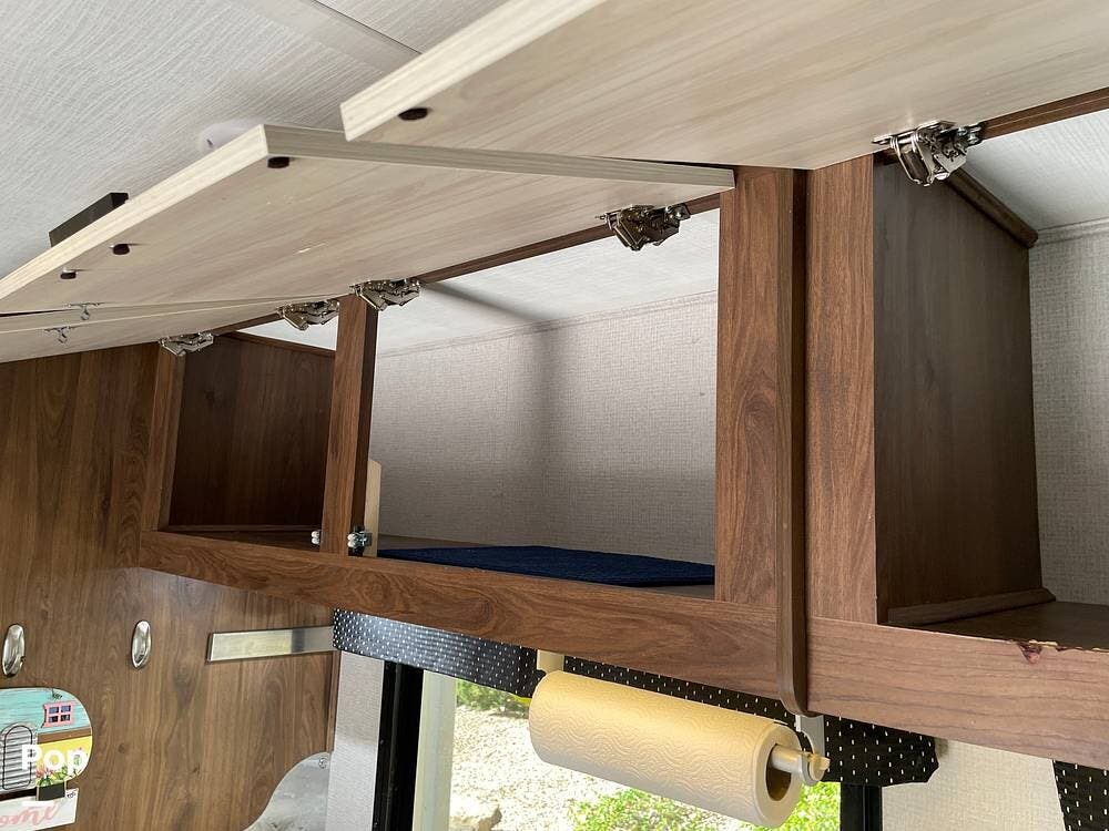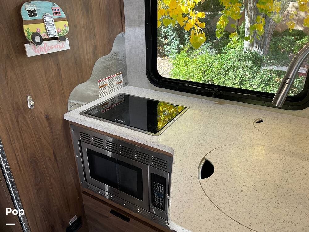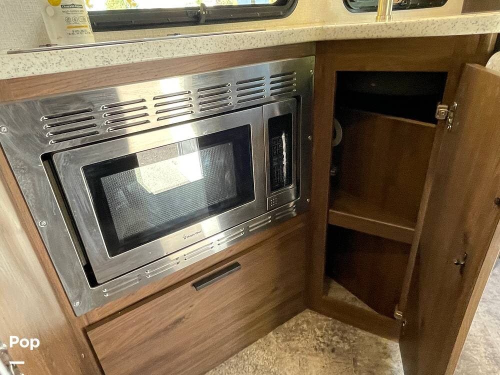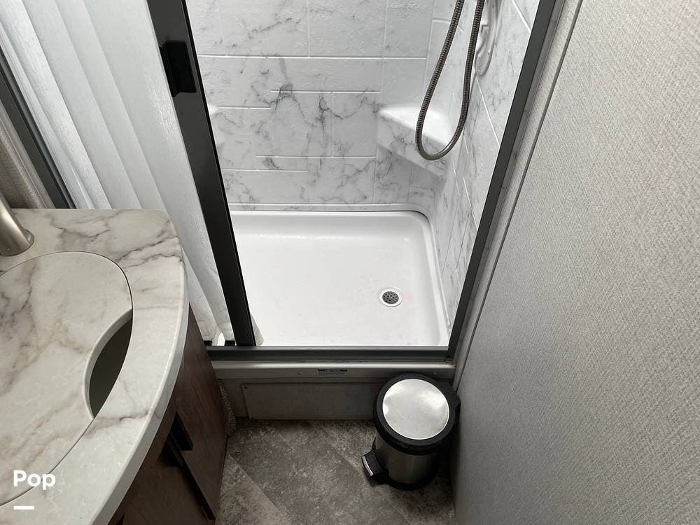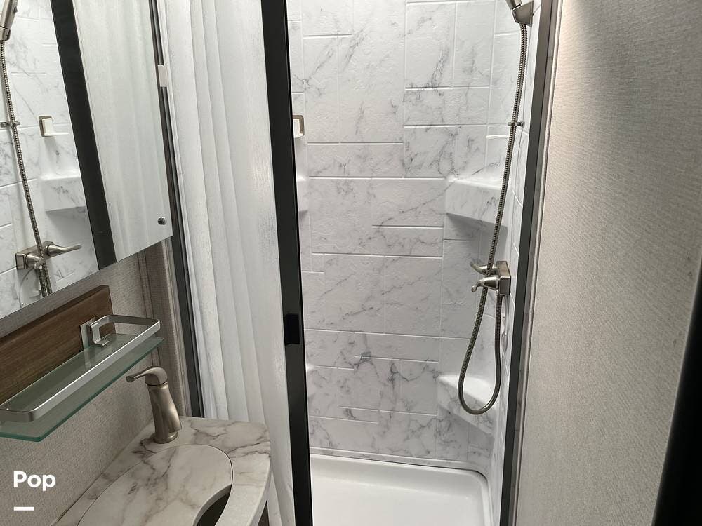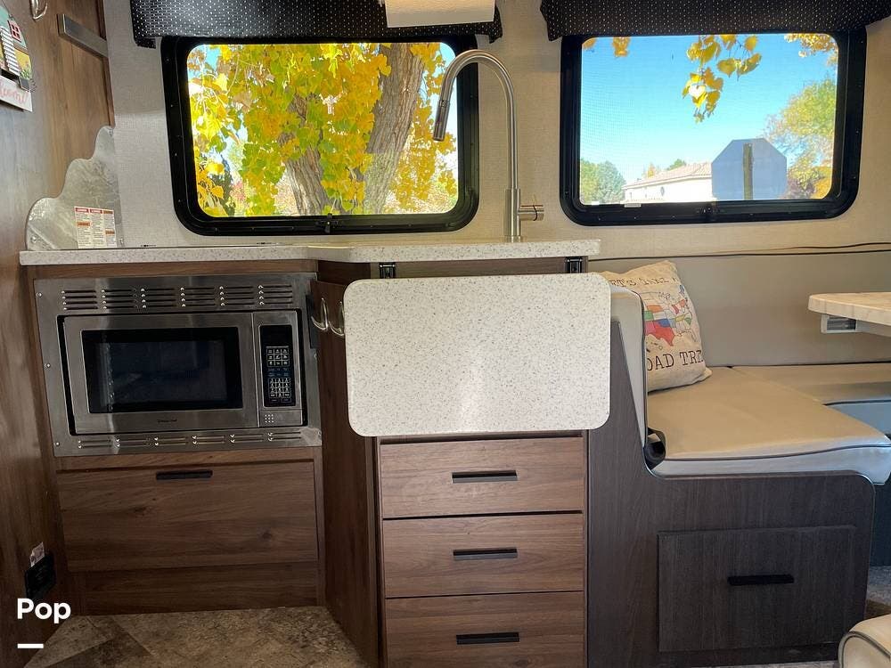Step inside and you'll find a beautifully designed interior with high-end finishes, modern dcor, and thoughtful details throughout. The open floorplan features a slide-out with a comfortable queen bed, a spacious dinette that converts into an additional sleeping area, and a fully equipped kitchen with solid-surface countertops, stainless-steel sink, convection microwave, and abundant storage.