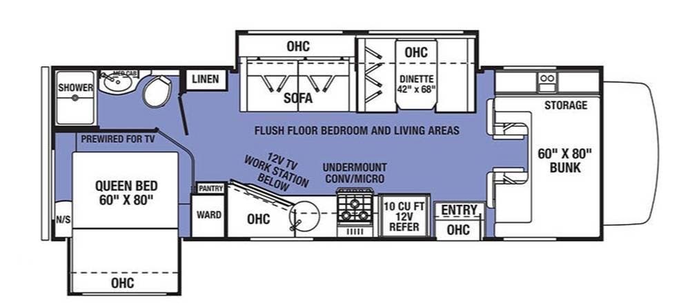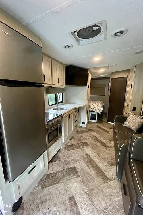 Modern amenities, including a touchscreen radio, color backup camera, and a 15,000 BTU A/C, make every journey effortless.