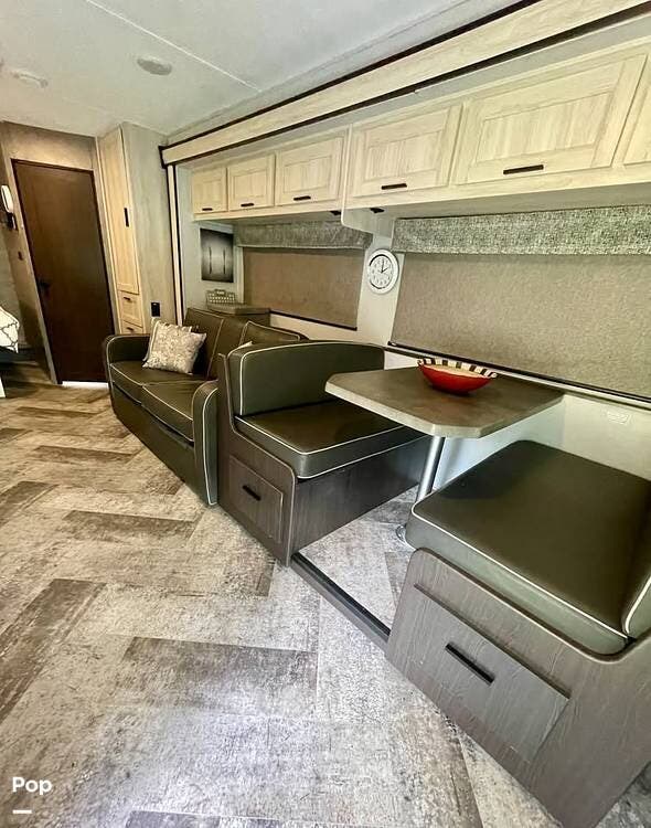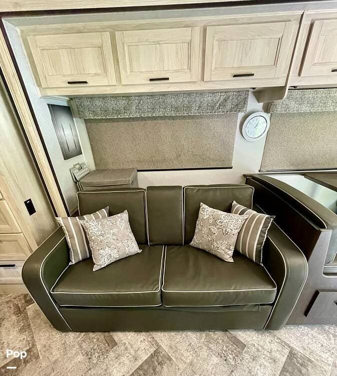 To the left, a comfy sofa and dinette provide ample seating, both of which convert to extra sleeping space.