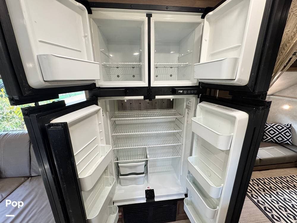 The well-appointed kitchen includes a 12 cu. ft. 4-door Norcold refrigerator, microwave, three-burner stove, oven, and ample counter space for meal prep.