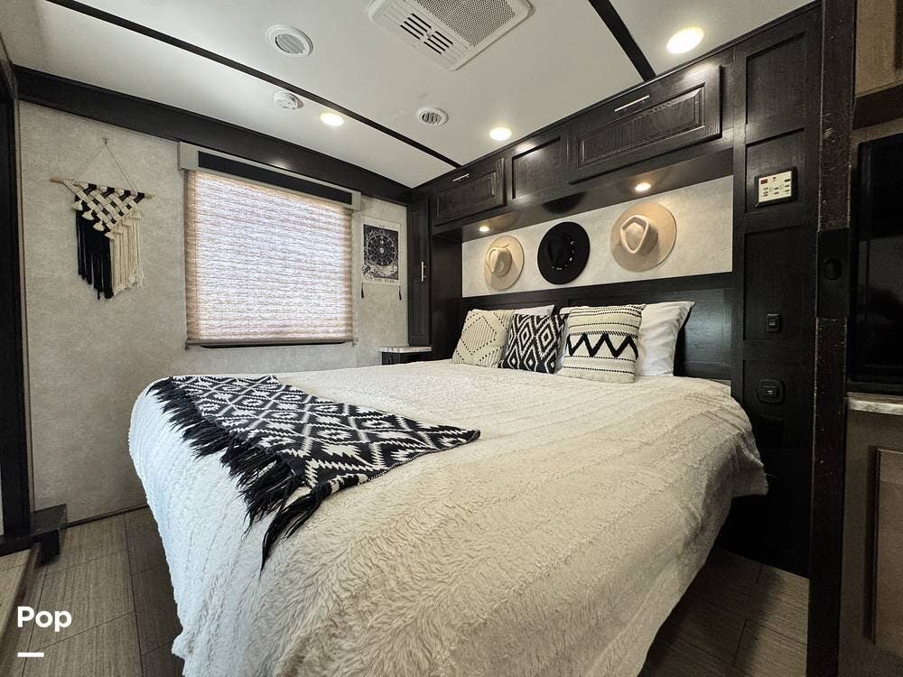 Designed with both families and couples in mind, it offers sleeping space for up to ten people with five sleeping areas. A true king-size bed in the private rear bedroom, bunk beds in the slide-out, a power overhead bunk up front, a convertible dinette, and a jackknife sofa.