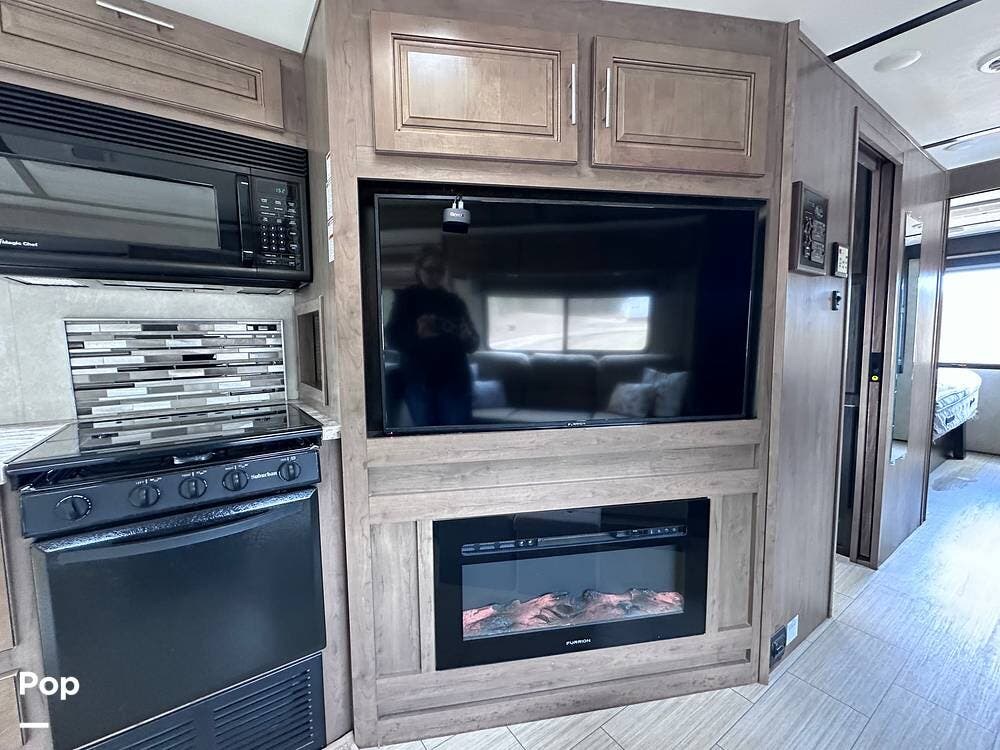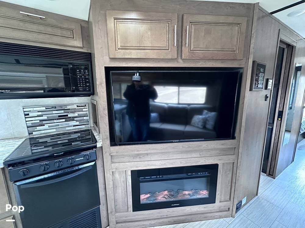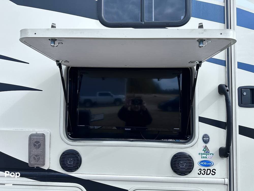 Enjoy entertainment under the skies with the exterior TV, perfect for sunset movie nights at the campground.