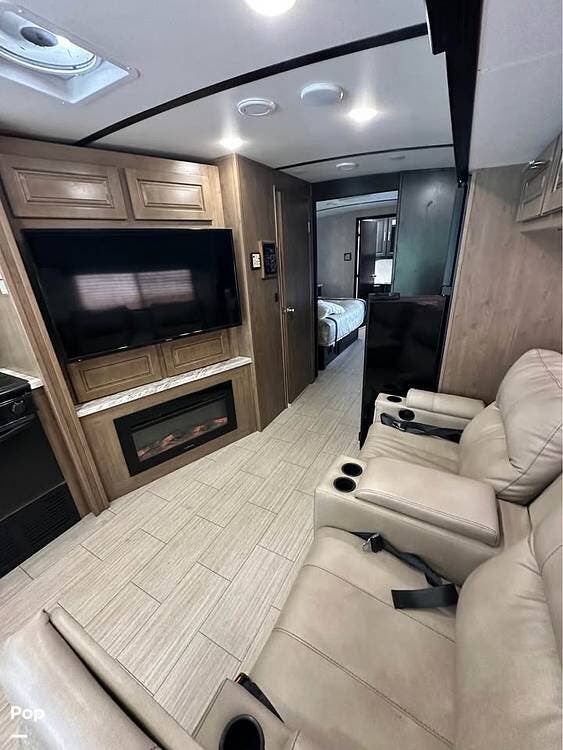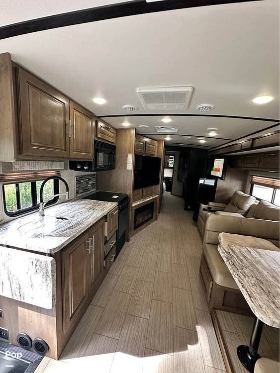 Step inside and you're welcomed by a thoughtfully designed interior that feels more like a modern apartment than an RV. The open floor plan includes two large slide-outs that dramatically increase the living space, with comfortable Ultraleather seating, a dream dinette, and an electric fireplace beneath a 40" LED TV. The gourmet kitchen features solid-surface countertops, a four-door refrigerator, a microwave, and a generous pantry--perfect for preparing meals on the road.