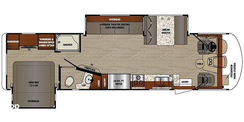 Have a look around at what will make each stay a pleasure. King bed. Two TVs inside, one outside. Two slides. FOUR recliners. Blu-ray player. Fireplace. Big fridge (got beer??). Gobs of storage inside and out. Did you notice that the shower and the commode are separate spaces, allowing two people to use them simultaneously?