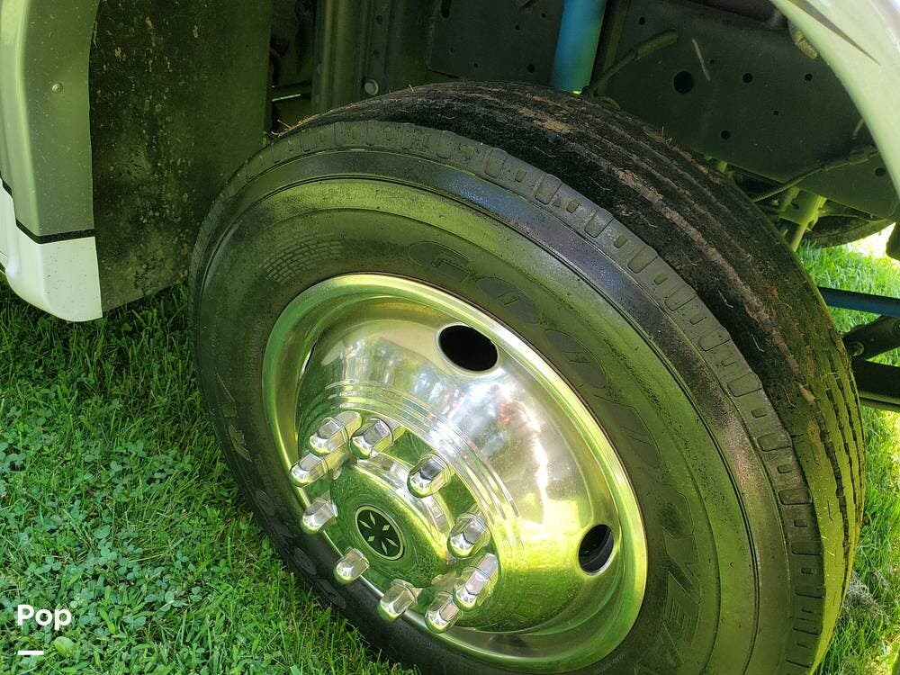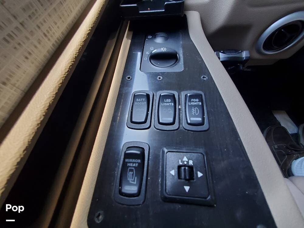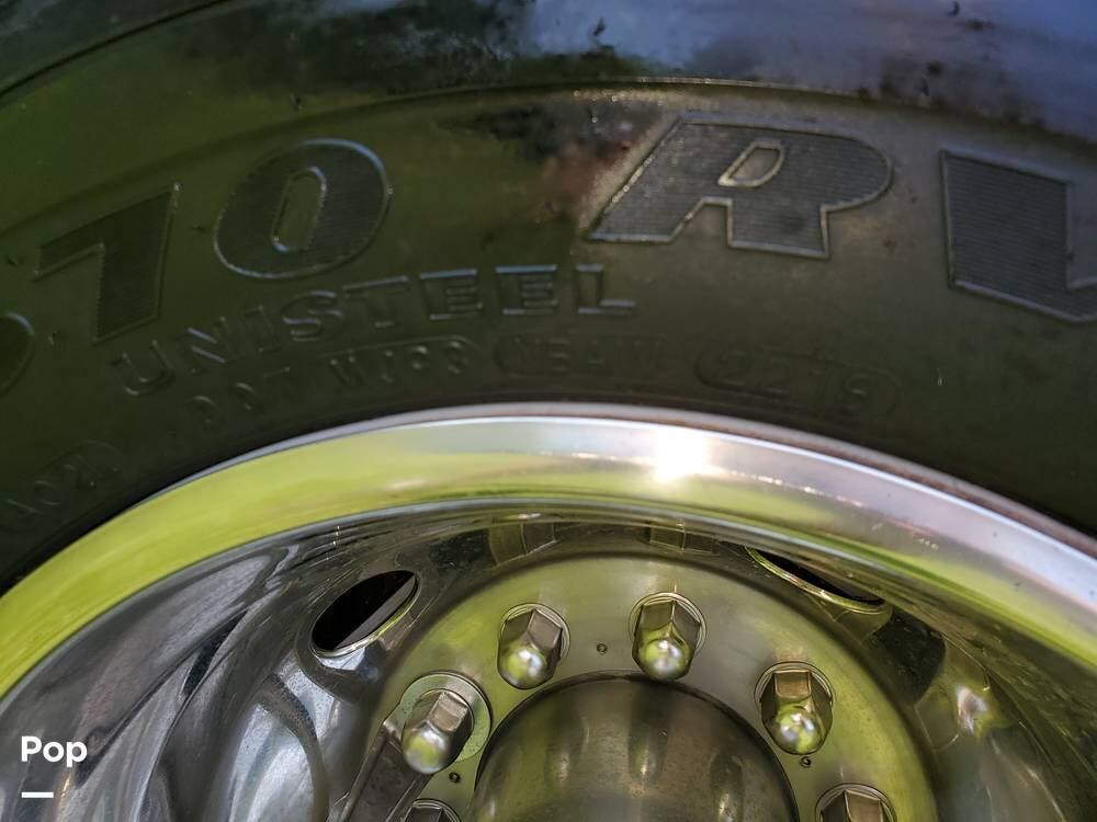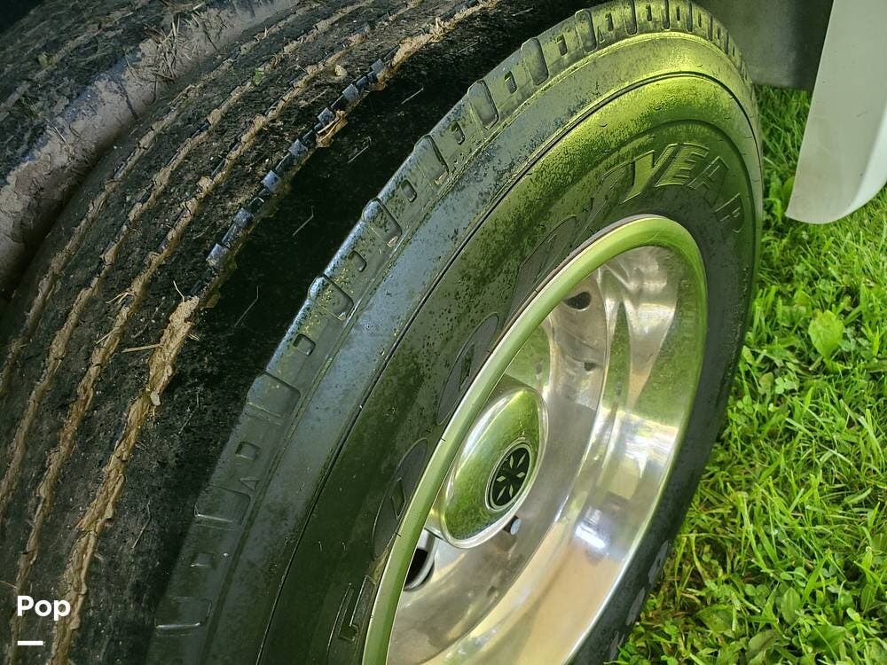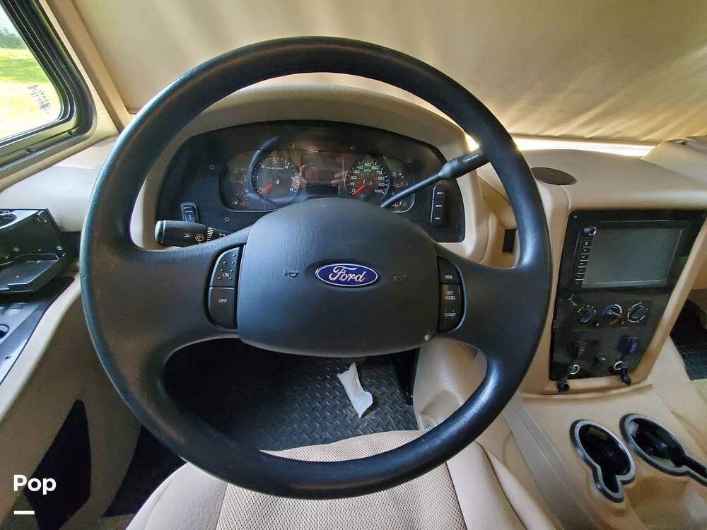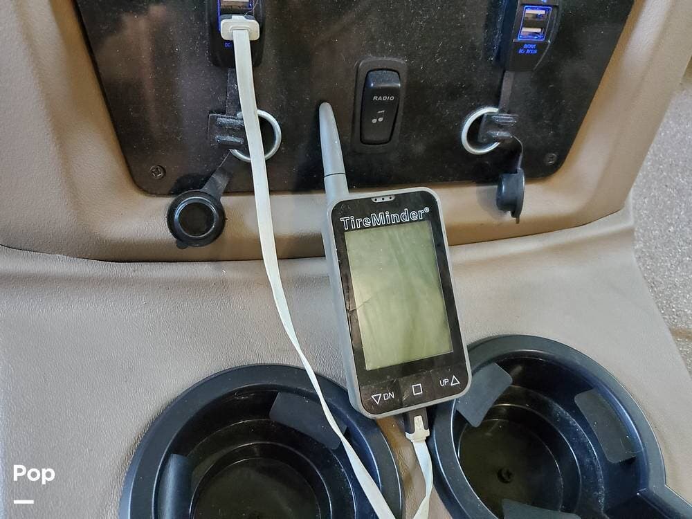 And low maintenance. Slide toppers. Fiberglass roof. Tire Minders, with the valve stems for the inside rear tires brought to the outside! Ford Triton V10 high-torque engine. Black tank flush. Rear ladder. Touch-panel controls and monitors.