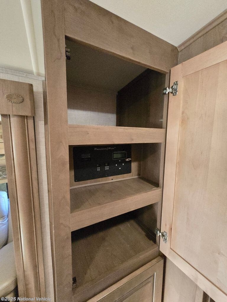 The private master suite offers a walk-around king bed, wardrobe slide with plenty of closet space, and a second LED TV. Over the cab, a power drop-down bunk adds additional sleeping capacity, making this coach perfect for couples or small families. With features like automatic leveling jacks, a power awning with LED lighting, outdoor entertainment setup, and generous basement storage, the Georgetown GT5 34H is as functional outside as it is inside.