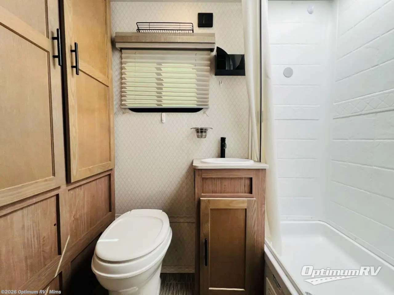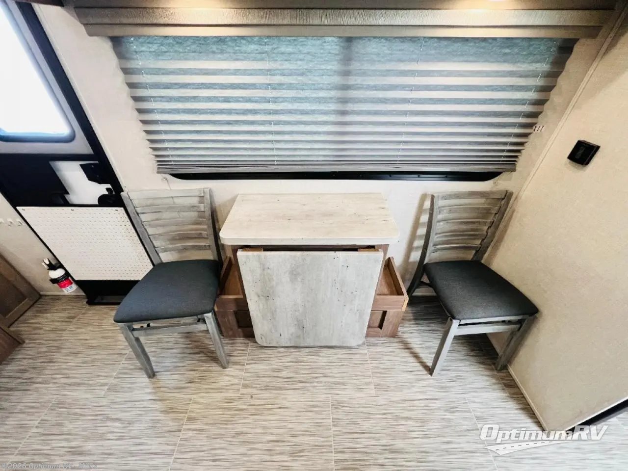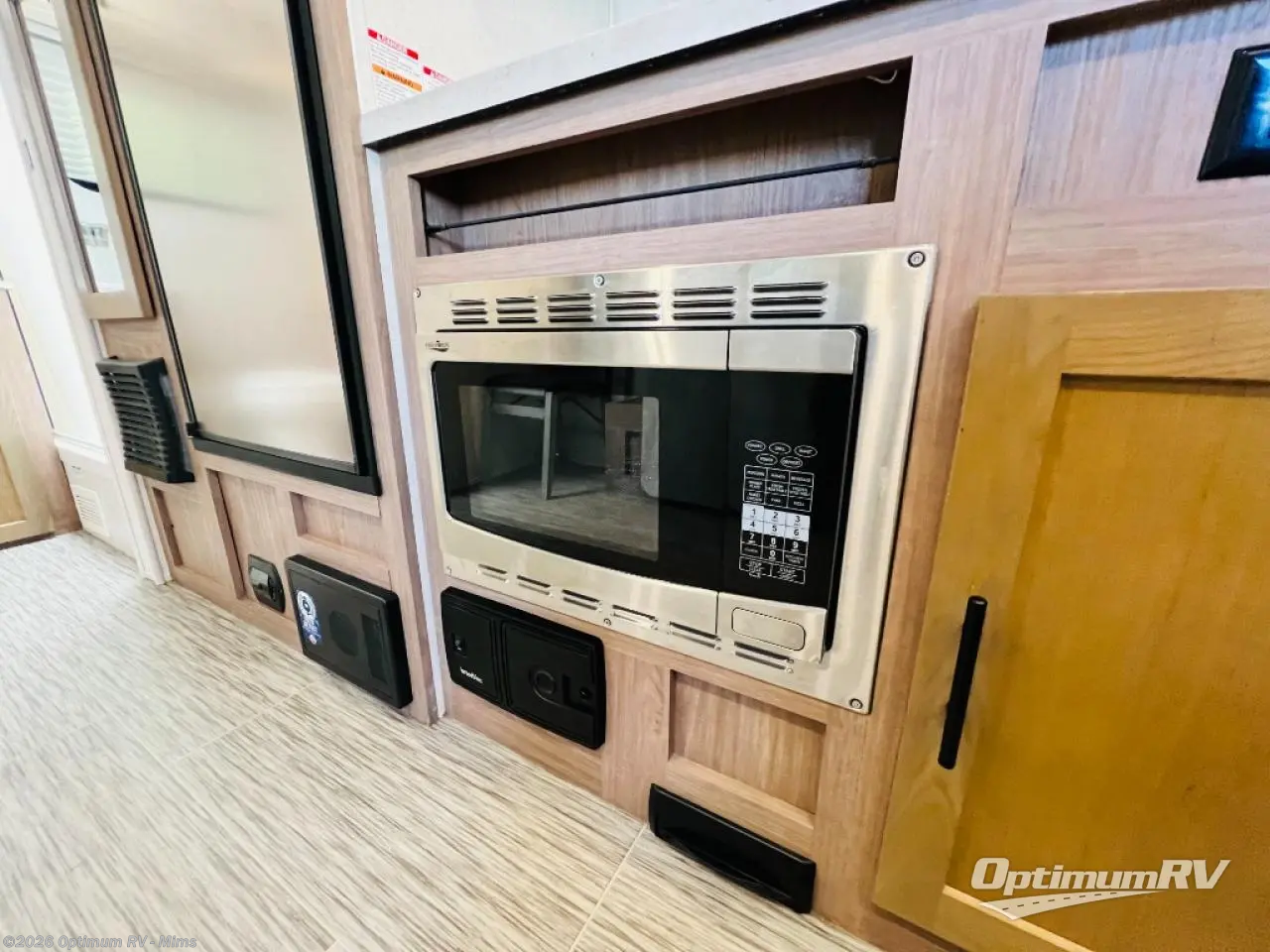 You will have a living area with a sofa to relax on during the daytime and a queen Murphy bed at night all in the front of this trailer. You can make meals using the two-burner cooktop and dine at the chairs with table in between when you aren't outside under the 11' power awning. You will surely appreciate all of the storage throughout including inside the pantry, overhead cabinets, and in the rear bathroom's wardrobe. And if that's not enough, the exterior pass-through compartment is available.
