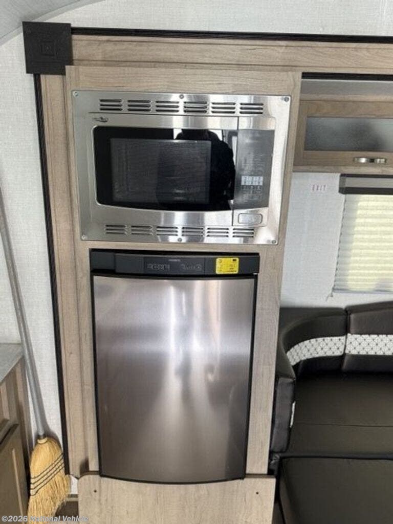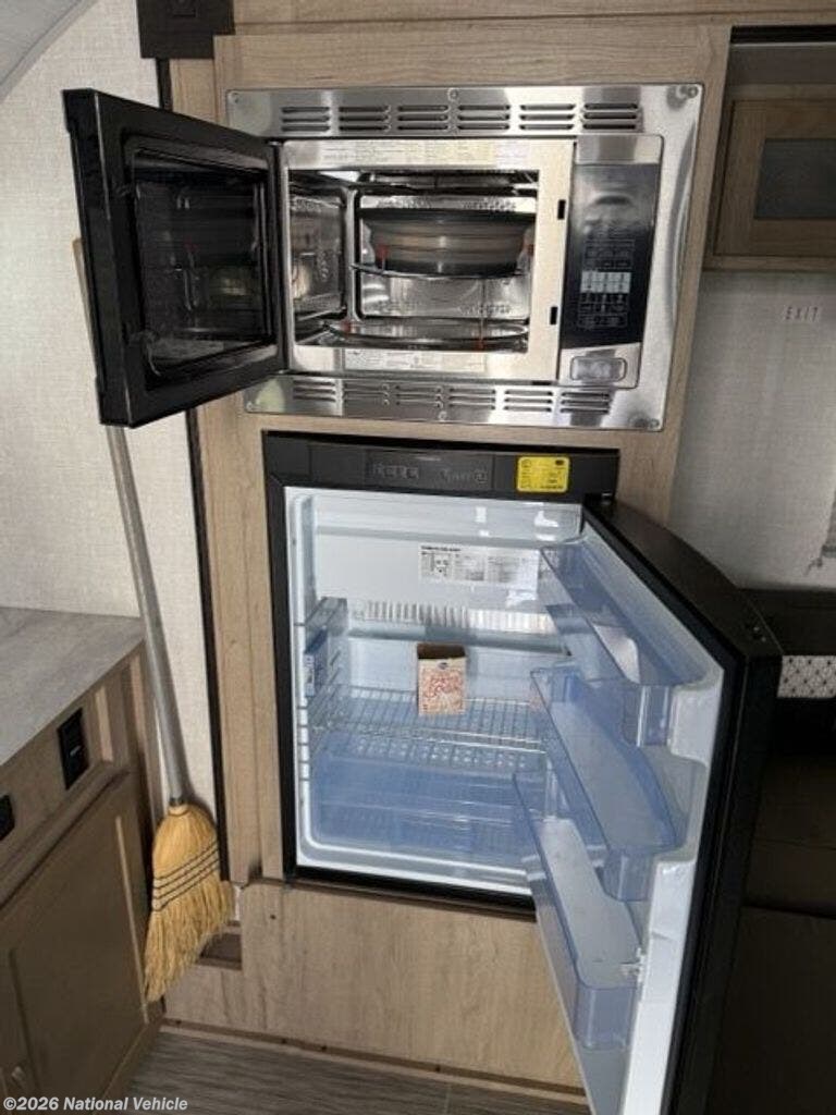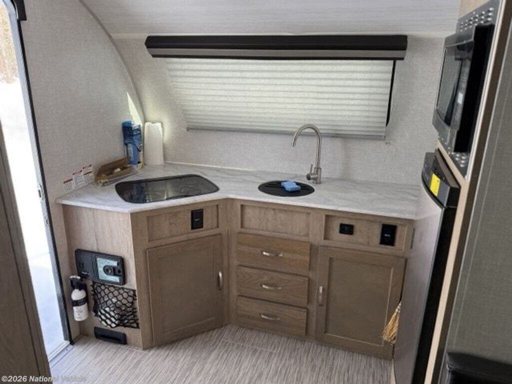 Step inside and you?ll immediately notice the bright, modern interior with large windows, stylish cabinetry, and smart space utilization. The spacious rear kitchen layout is a standout feature, offering generous counter space rarely found in trailers this size. Prepare meals with ease using the two-burner cooktop, convection microwave, deep stainless sink, and large refrigerator, all surrounded by ample storage for cookware and pantry items.
