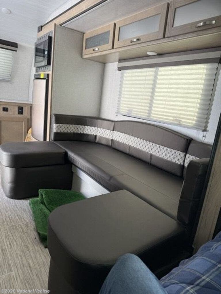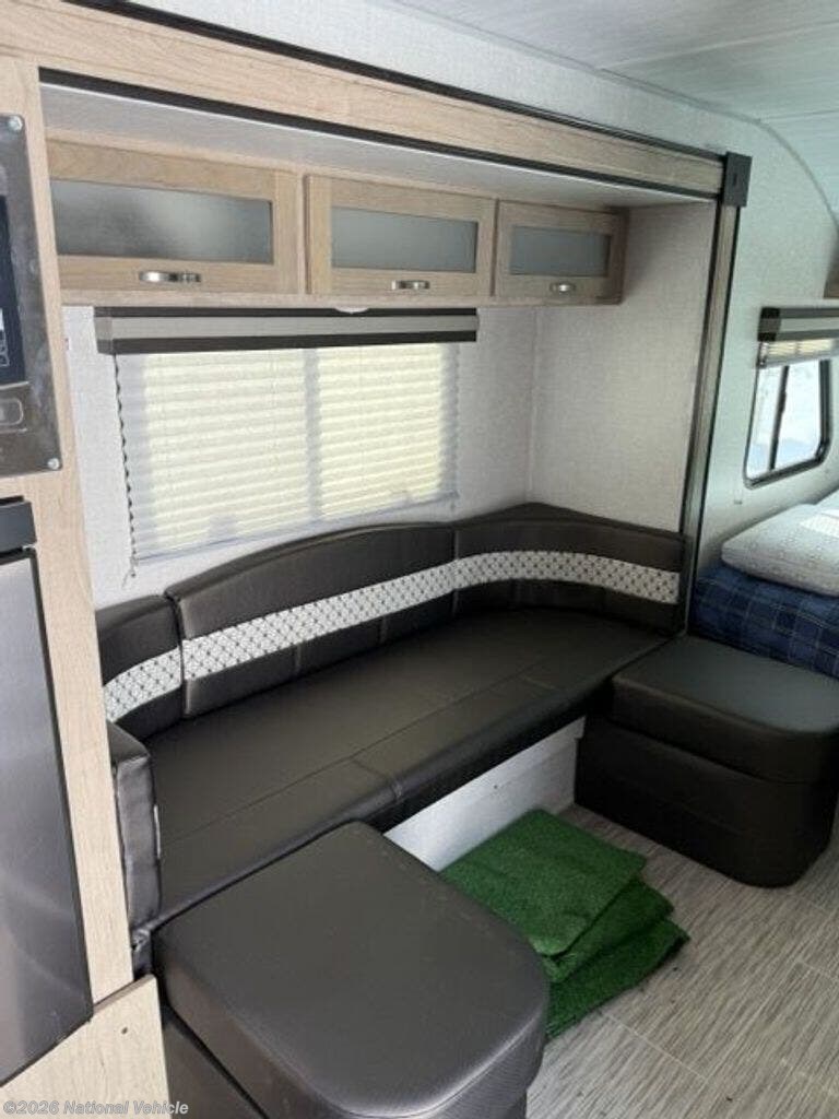 The comfortable dinette lounge up front converts easily into additional sleeping space and provides the perfect place to relax, dine, or plan your next adventure. Large panoramic windows fill the cabin with natural light and offer great campsite views.