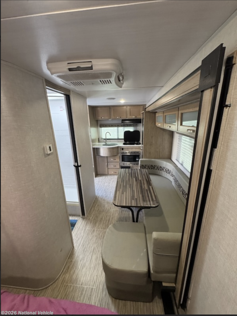 Comfortable sleeping accommodations include a plush queen bed along with convertible seating for additional guests, making this unit ideal for couples or small families. Large panoramic windows provide abundant natural light, while integrated shades offer privacy when desired. Efficient heating and air conditioning systems ensure year-round comfort in a variety of climates.