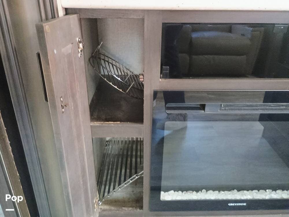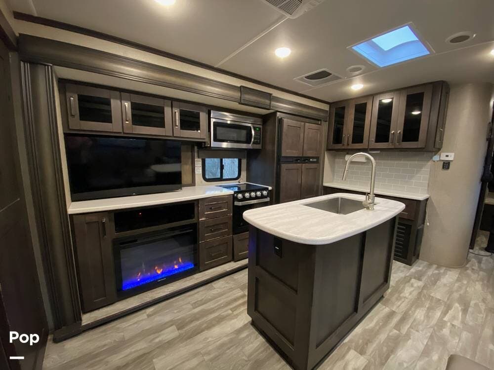 The living room features theater seating, a large TV, and a built-in fireplace for those cooler nights. Oversized windows let in lots of natural light, and the cozy layout makes relaxing easy.