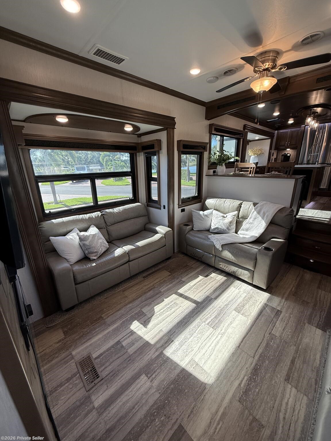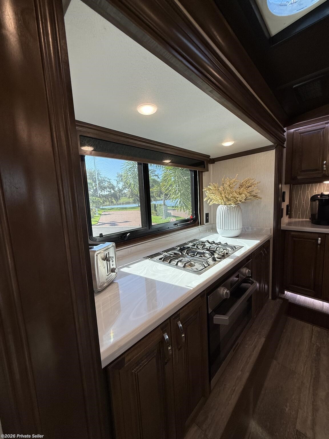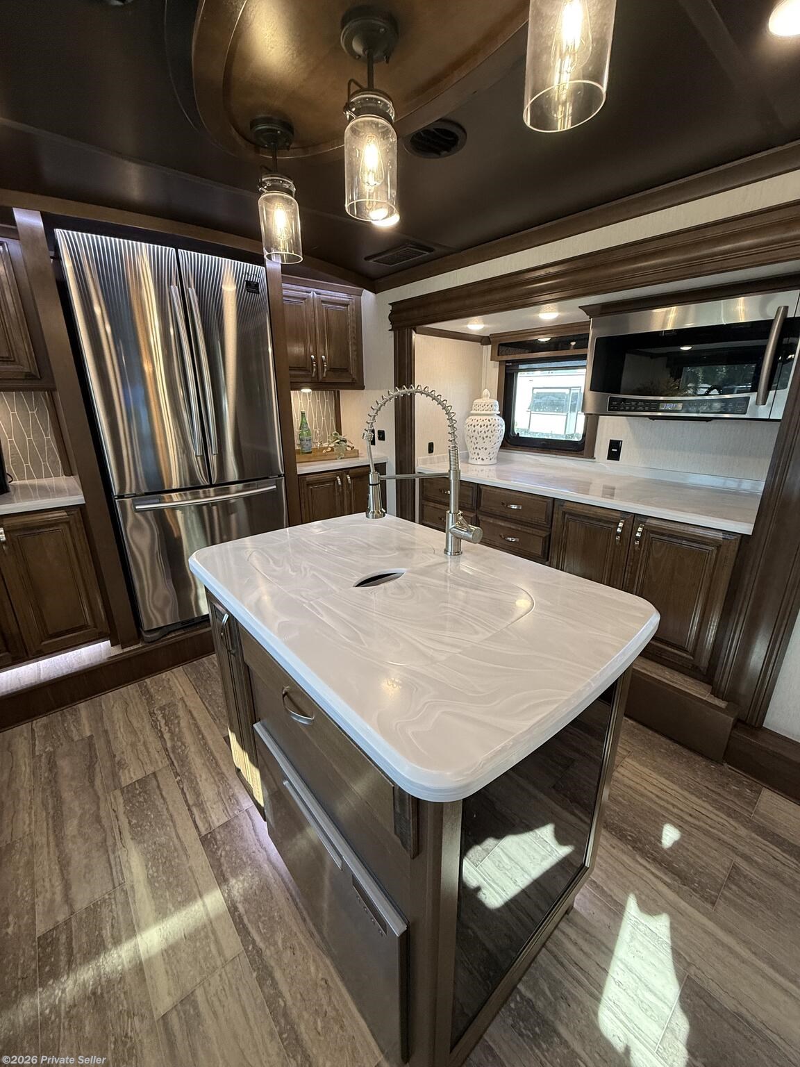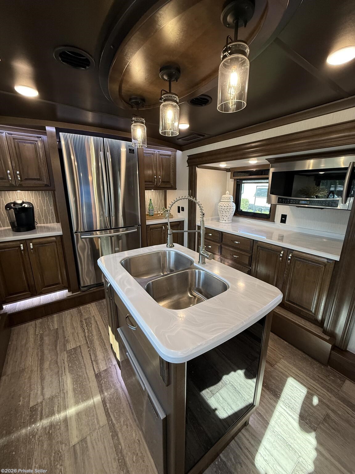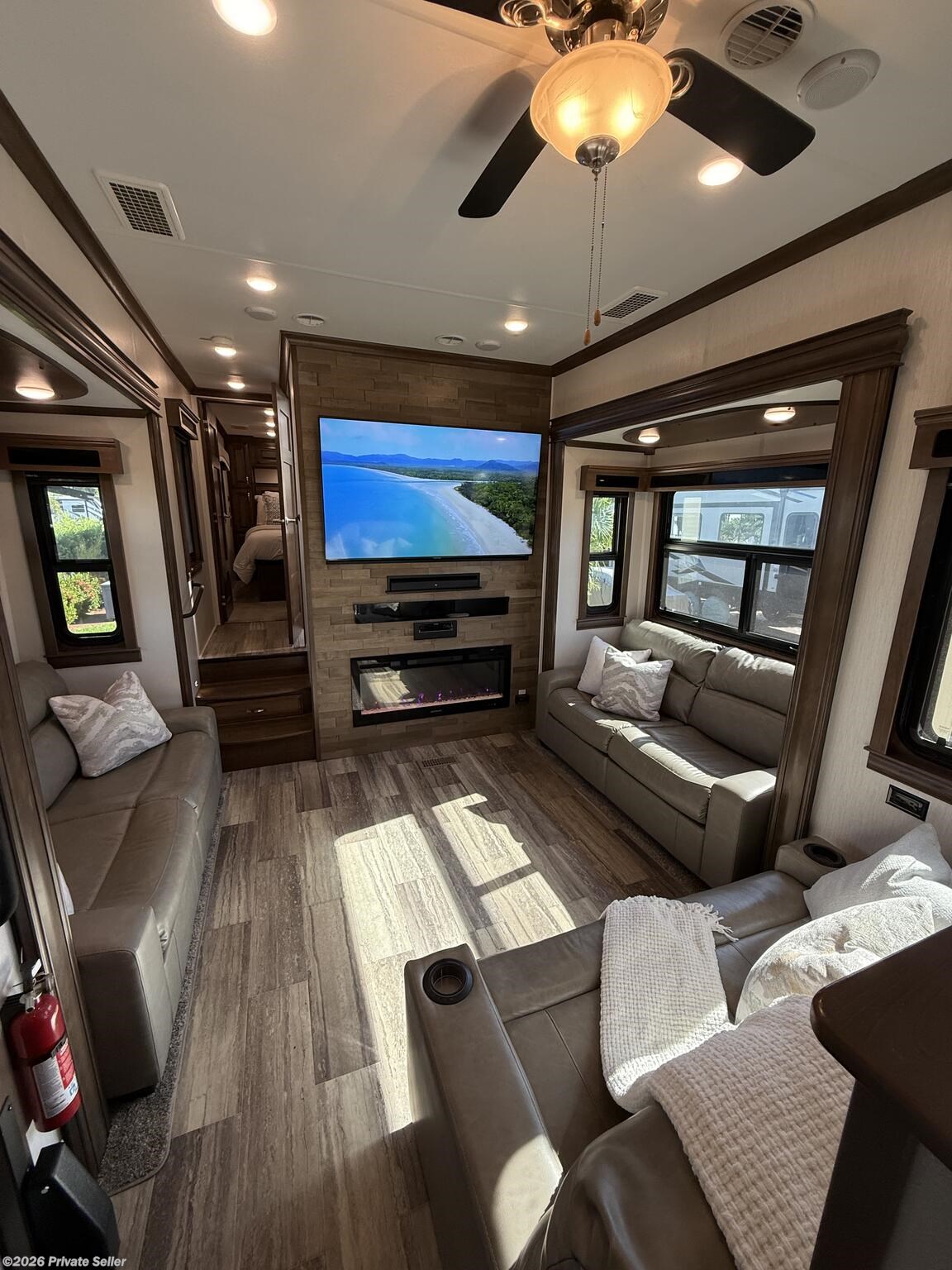 Meticulously maintained! Barely used! Approx. 3000 travel miles. Has GARAGE! Stackable W/D, DISHWASHER and OVEN never used. TRI-AXLE, tires kept covered & in excellent condition. HYDRAULIC slides & auto hydraulic leveling. Wool-glass, residential insulation w/ dual vapor barrier giving a R16 INSULATION value in the side walls/slide rooms. Roof/flooring has R38 INSULATION value, designed for 4 SEASONS LIVING. $25,000 add. options - Max Graphics Package with painted caps, 3rd A/C (15 BTU) w/high performance energy mgm system, SLIDE TOPPERS, instant hot water heater. LP gen prep, luxury pkg, ultimate electronic pkg w/ 50â outside TV and bluetooth speakers, Trail Air 21k hitch, solar power w/inverter. AC/Heat in garage & underbelly storage. RV king bed, reclining loveseat & 2 sleeper sofas. Rain sensor ceiling vents, hardwood soft close cabinetry, luxury flooring, solid surface counters, 2 new smart TVâs 65â & 40â. Tons of storage! Located-Tides RV Resort! Lifted Golf Cart for sale too!