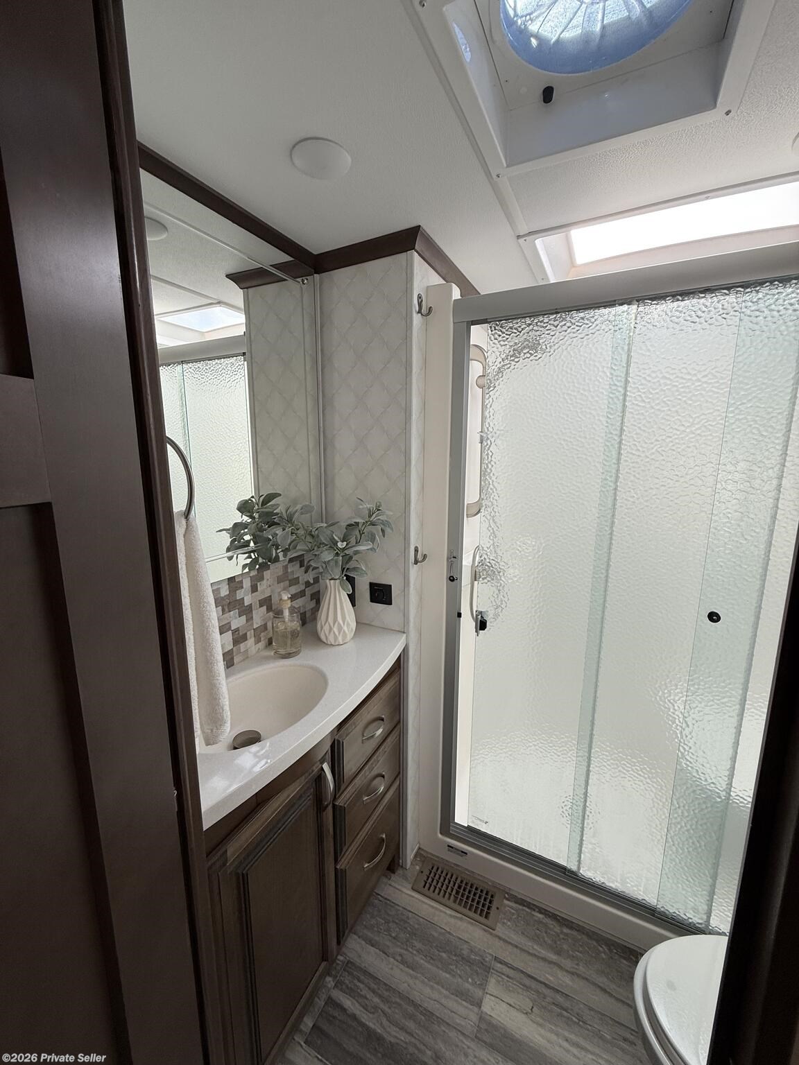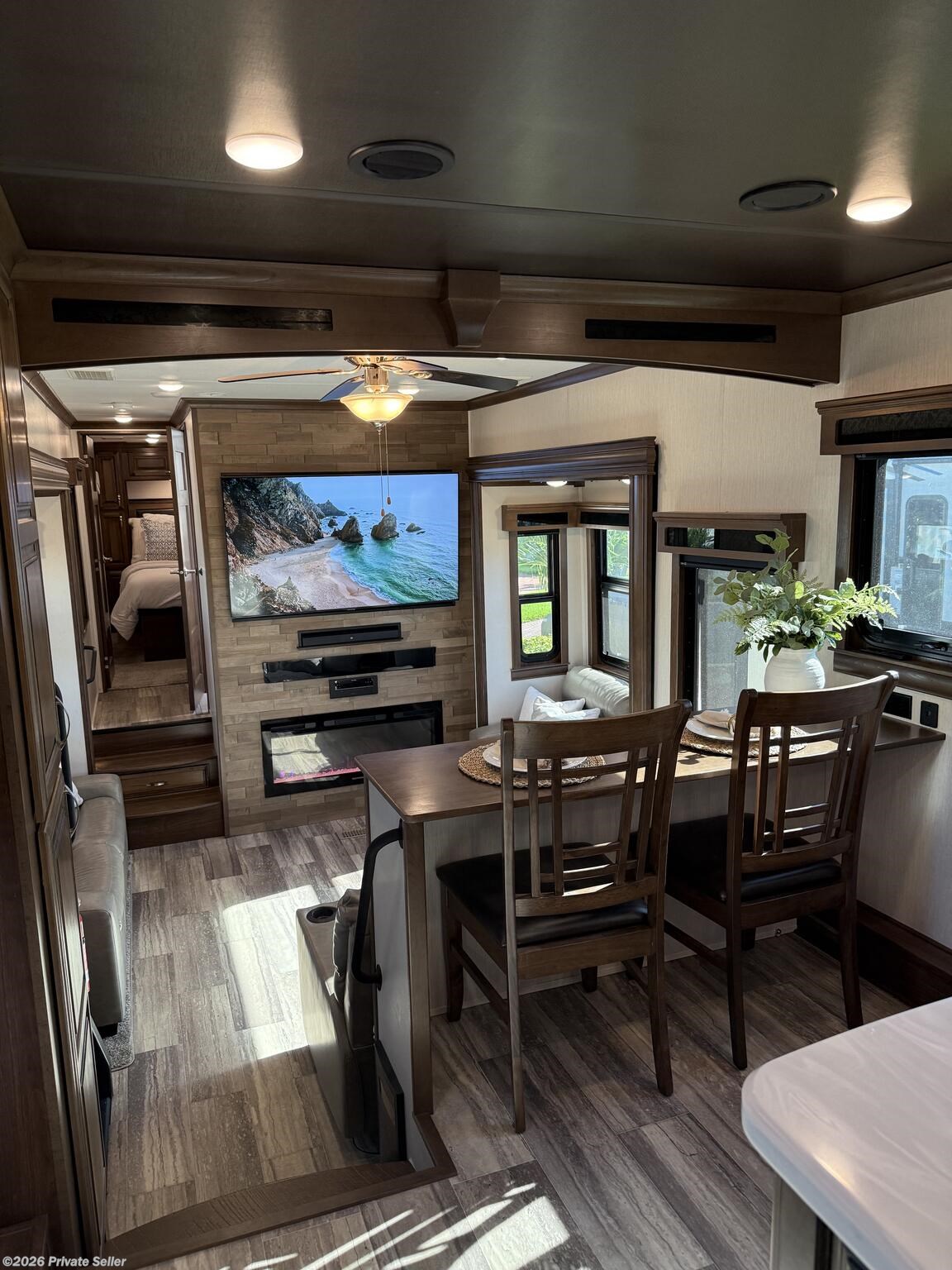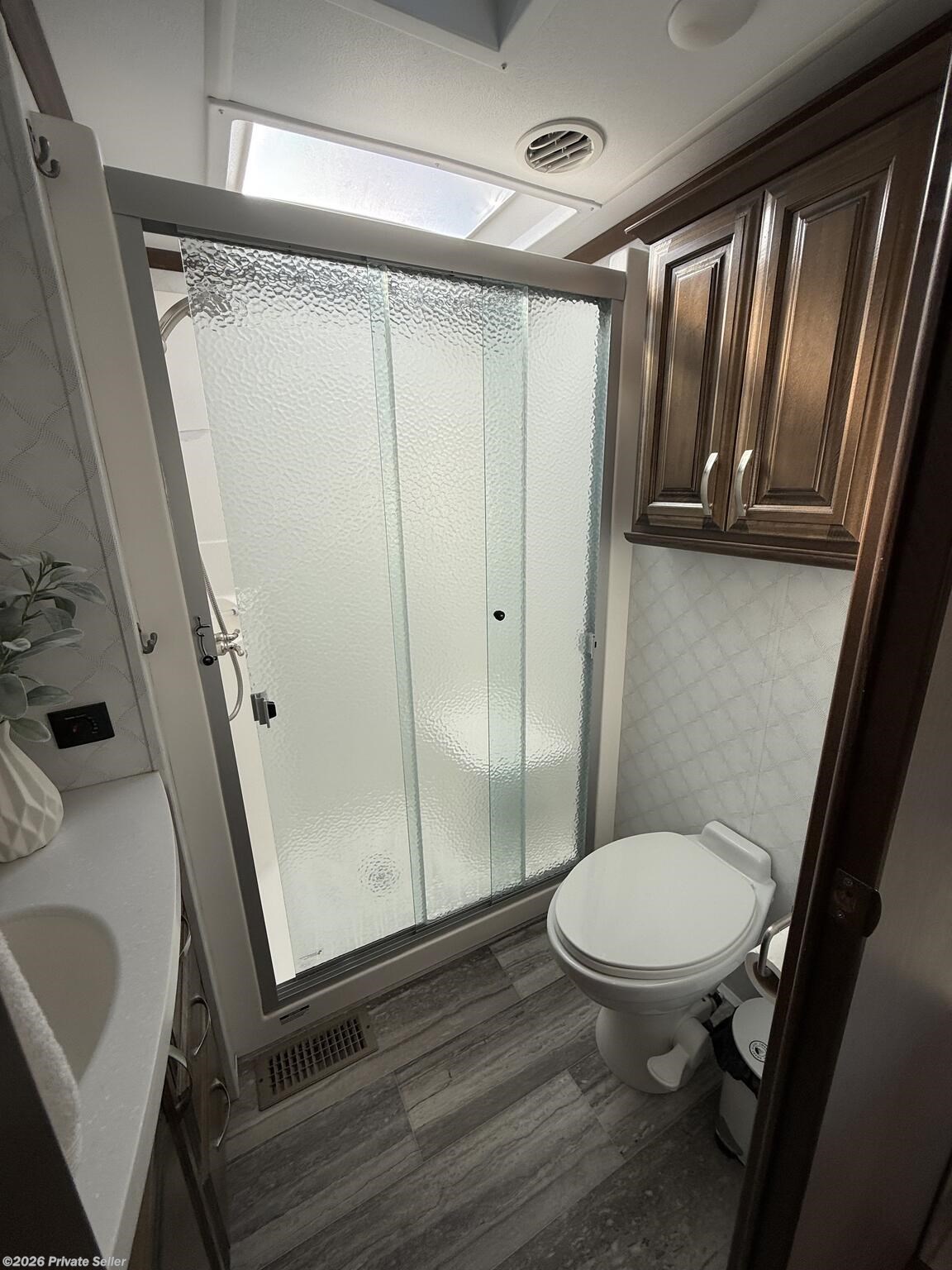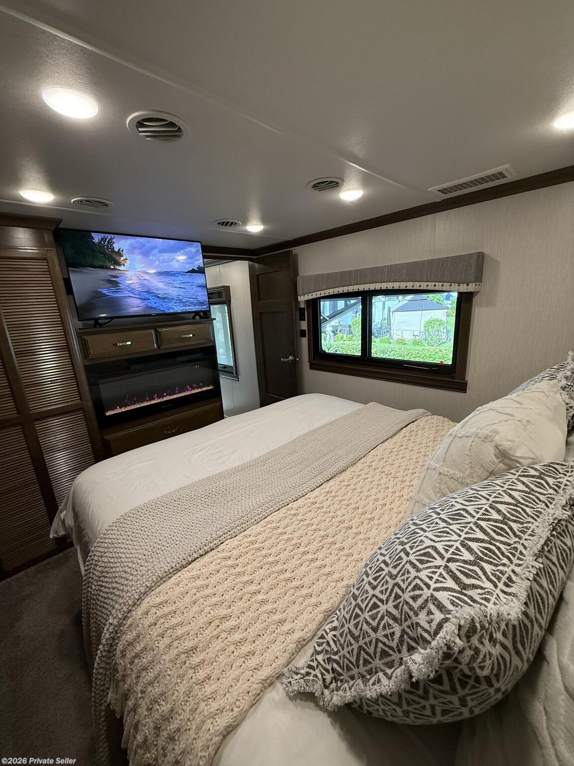 Ceiling Fan, Central Vacuum, Day/Night Shades, Fireplace, Glass Shower Door, Island Kitchen, King Size Bed, Kitchen Sink, Medicine Cabinet, Non-Smoking Unit, Overhead Cabinetry, Pillow Top Mattress, Power Seats, Recliner(s), Roof Vents, Shower, Sofa Bed, Solid Surface Countertops, Table and Chairs, Theater Seating, Toilet, Vanity, Wardrobe(s)