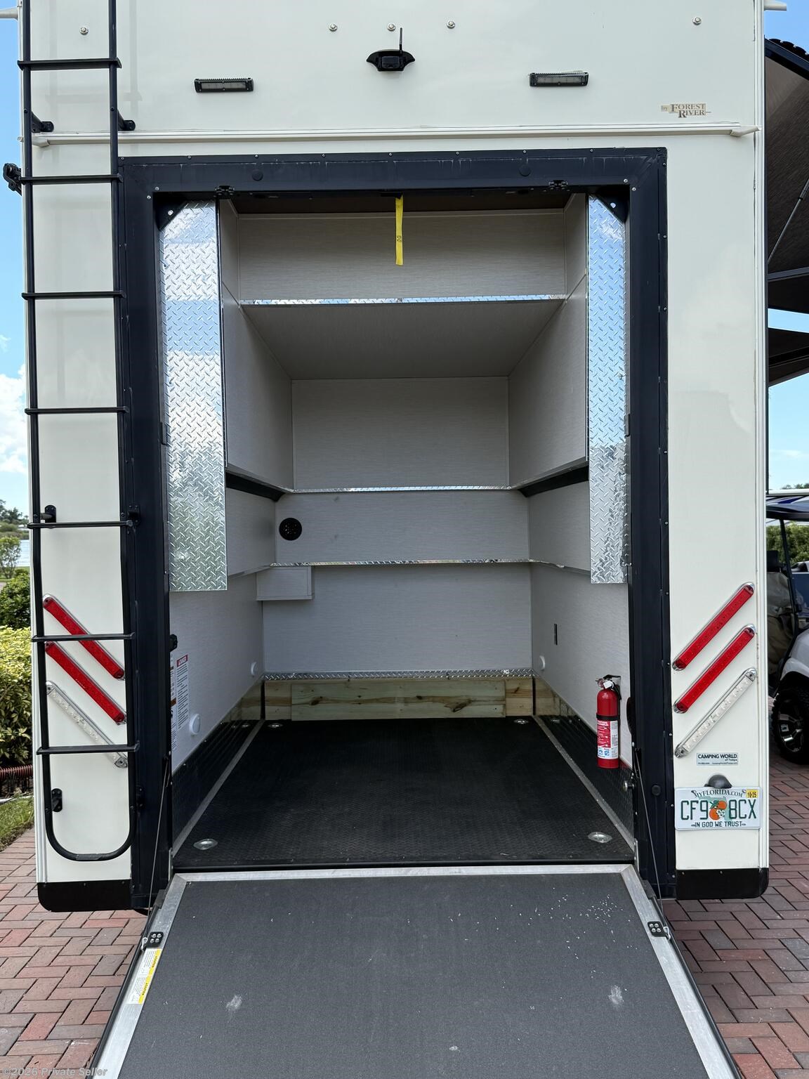 Alloy Wheels, Aluminum Entrance Steps, Automatic Leveling Jacks, Awning, Backup Monitor, Black Tank Flush, Enclosed Underbelly, Escape Door, Exterior Speakers, Fiberglass Sidewalls, Heated Underbelly, Keyless Entry, Ladder, Outside Entertainment Center, Pass Thru Storage, Power Awning, Power Roof Vent, Powered Landing Legs, Ramp, Rear Ramp Door, Roof Vent, Screen Door, Second Roof A/C, Side View Cameras, Skylight, Slam Latch Baggage Doors, Slideout, Slide-out Awning, Spare Tire Kit, SS Wheel Covers, Thermal Pane Windows, Tinted Windows, Upgraded Insulation Package -
