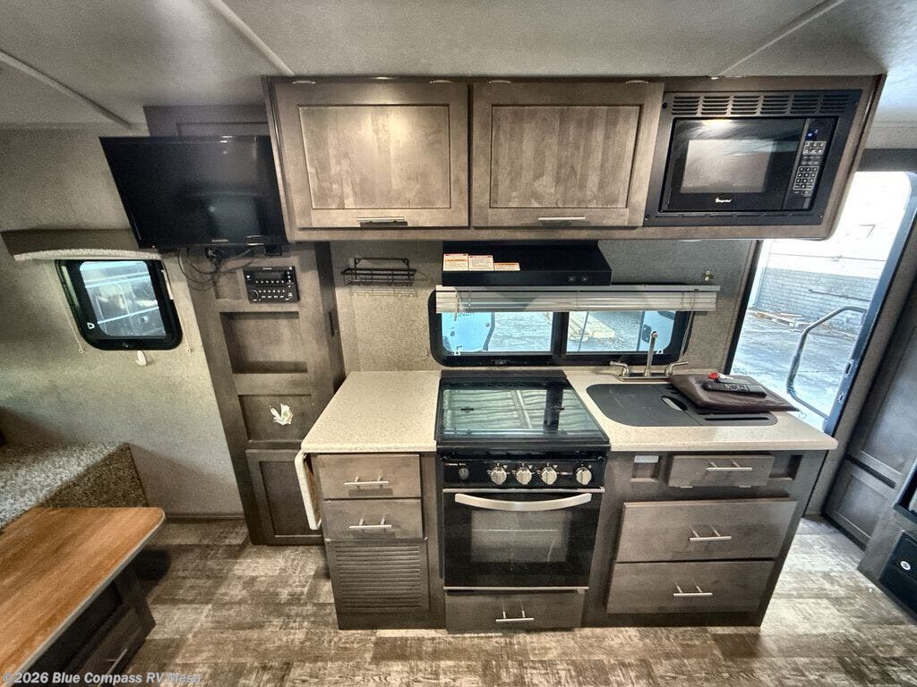 A front bedroom, a 72" sofa with a table and extra sleeping space for guests, plus a full bath for convenience makes this Rockwood Mini Lite travel trailer something to talk about! You can relax or dine on the sofa slide along the roadside wall, plus there are also cup holders for your drinks. You will find an entertainment center for your inside enjoyment, and there are plenty of overhead cabinets throughout this trailer for you to bring along your camping necessities. Outside, you will enjoy the 14' power awning, a pass-through storage area for easy access, and a gas grill to make meal prep a whole lot easier and fun.