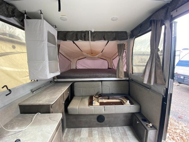 Do you desire a weekend getaway in the outdoors but still enjoy the comforts of home? Well then, this Forest River Rockwood High Wall Series is the folding pop-up camper for you! There is a U-shaped dinette for you to enjoy your meals or convert into an extra sleeping space at night. This model also features plenty of exterior storage to hold all of your camping needs, and the outdoor gas grill is sure to be a pleaser for the chef in your group. You can also choose between the front king or rear queen tent bed to enjoy your good night's rest.