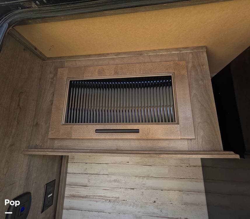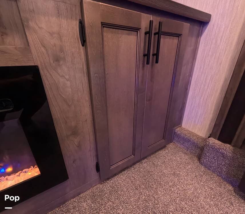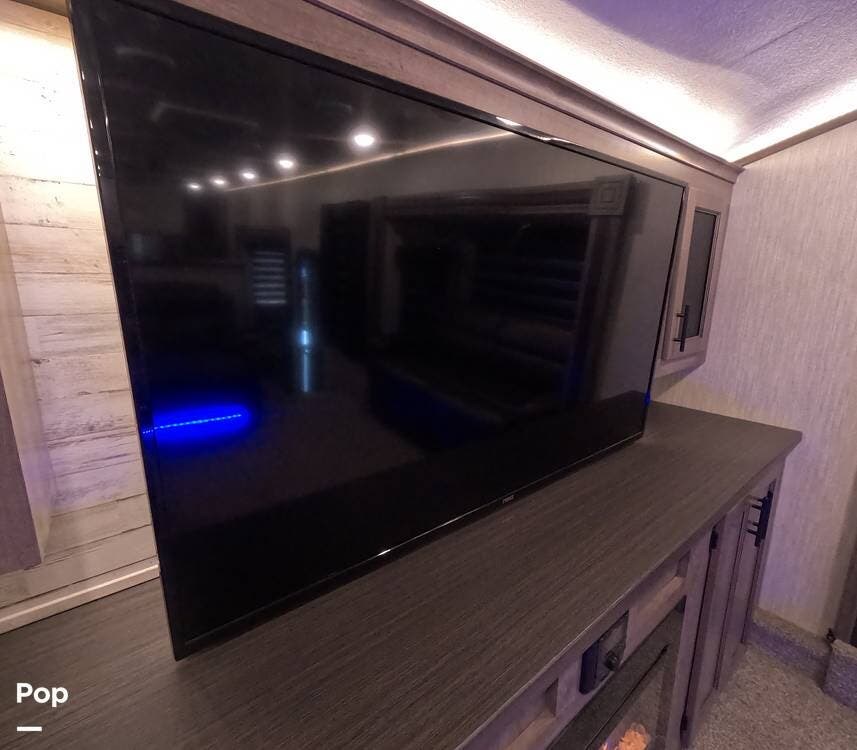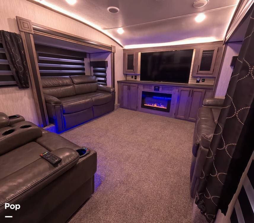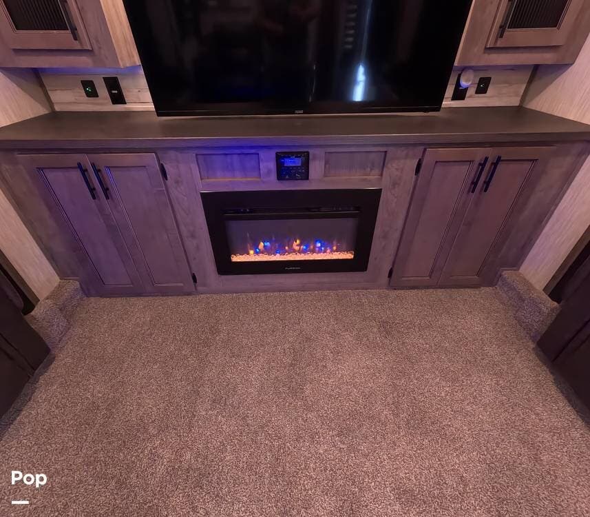The entertainment center features a cozy fireplace, which can heat the entire RV, and a flat-screen TV.