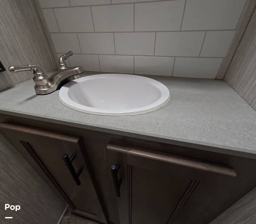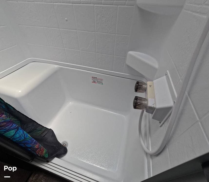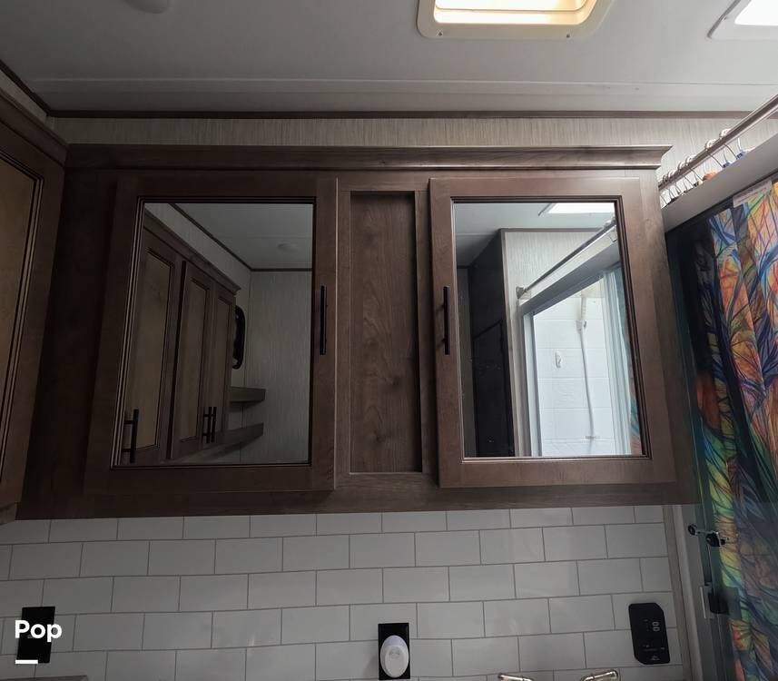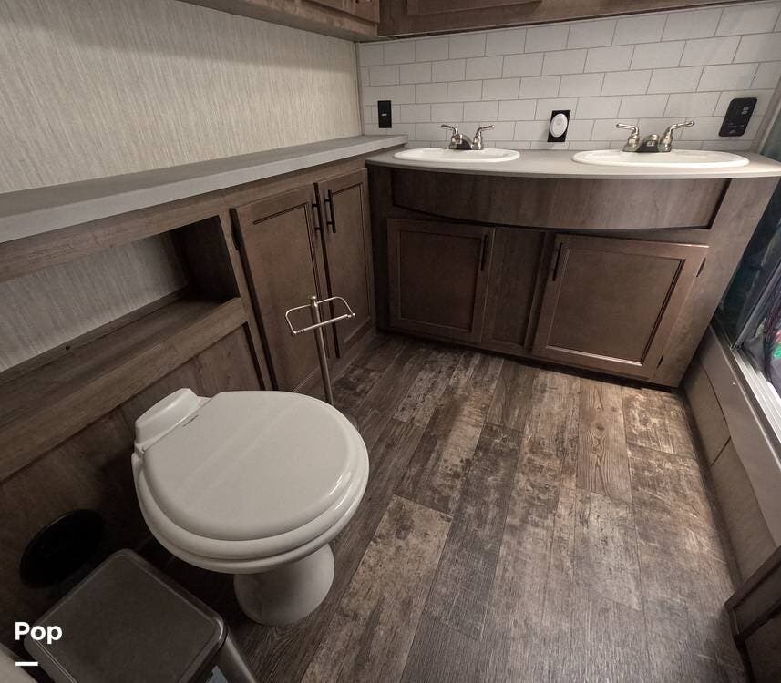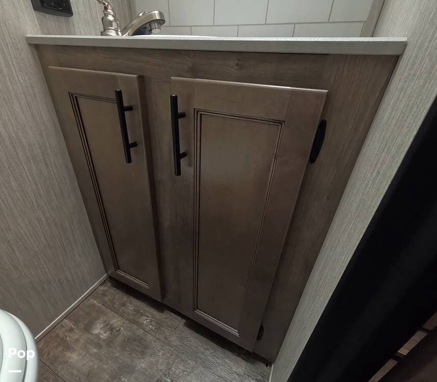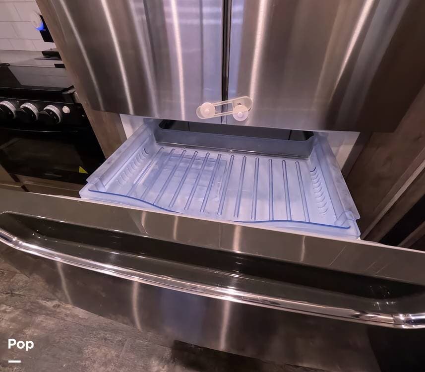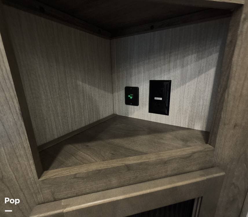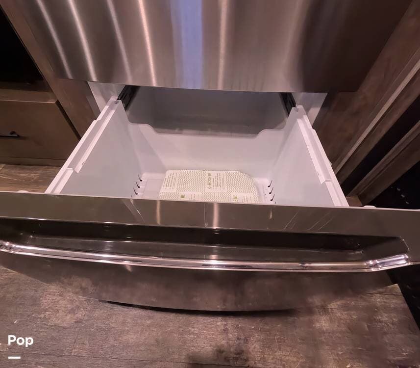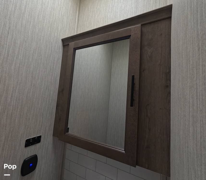 The roomy, fully equipped bathroom, located at the back of the RV, features his-and-her sinks, a spacious shower, and the necessary room and connections for a washer and dryer. A convenient half-bath is located next to the kitchen. Yes, a rare bath-and-a-half configuration exists in this RV!