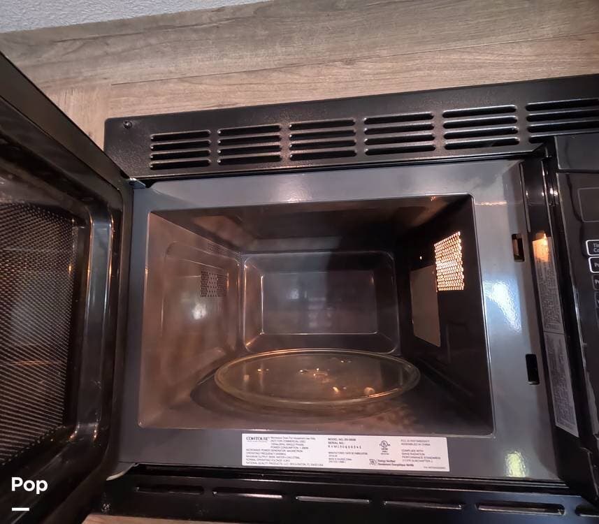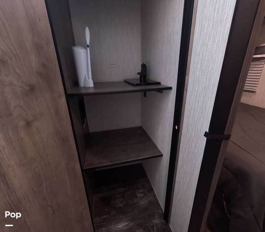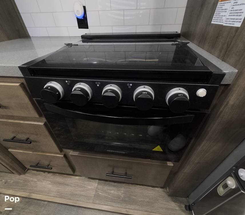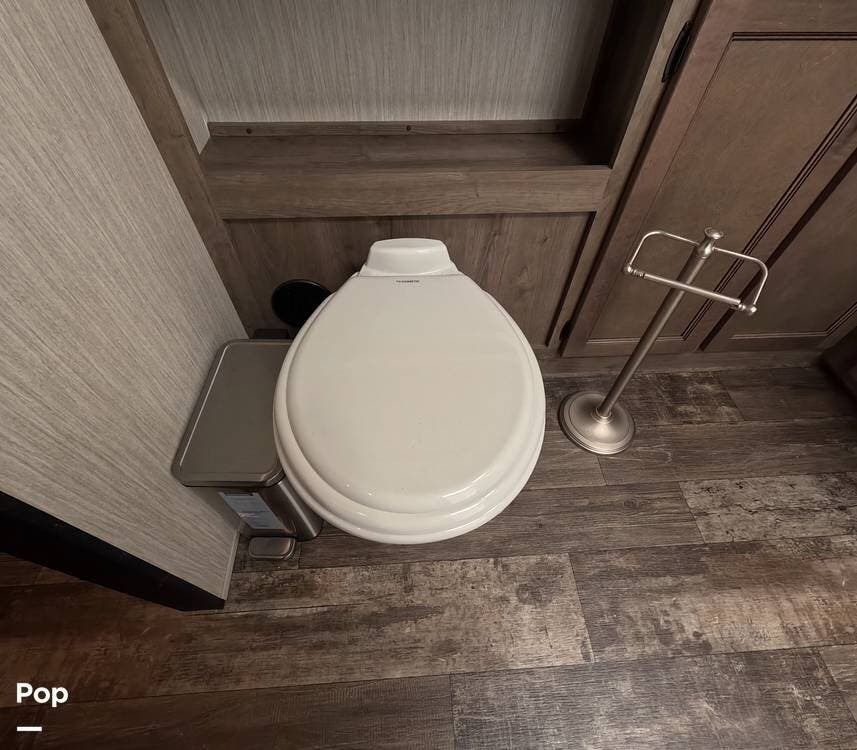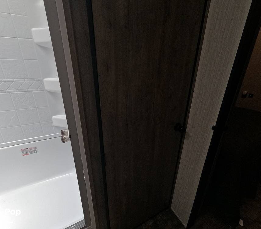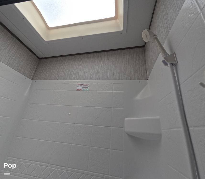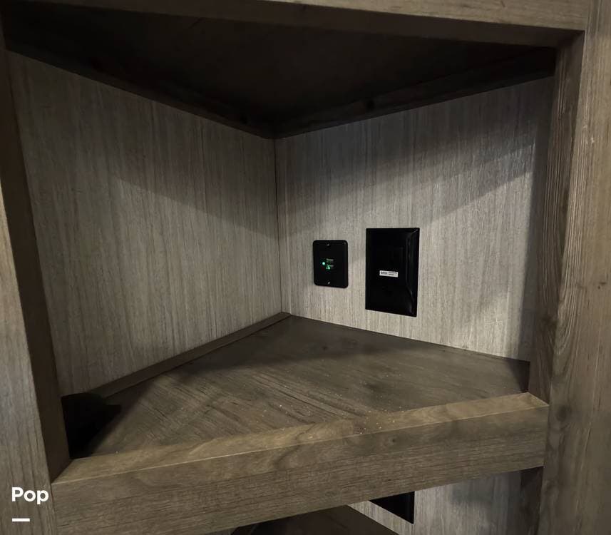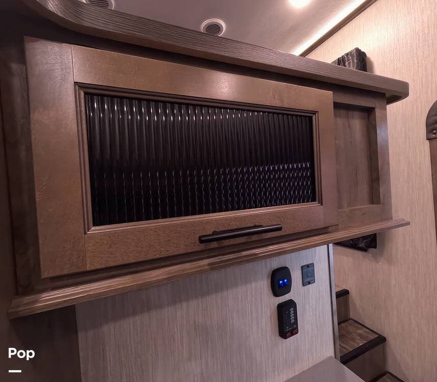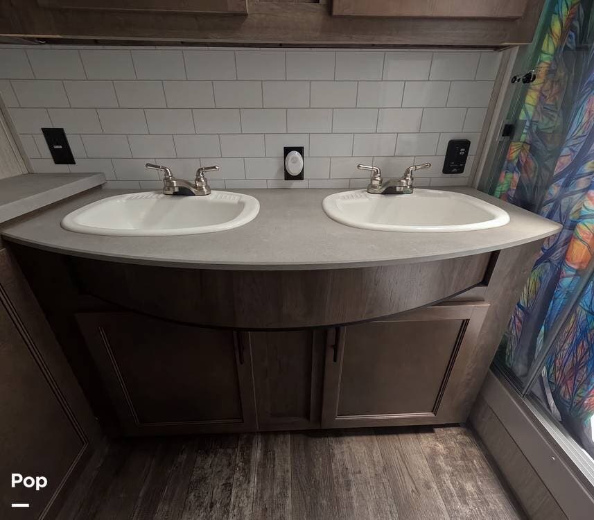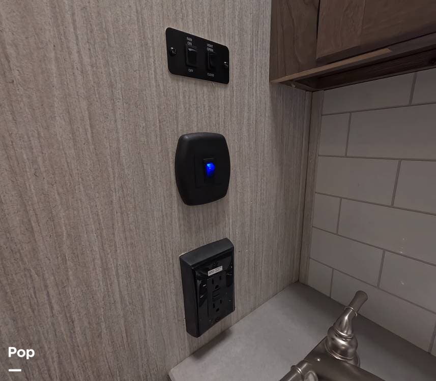 The roomy, fully equipped bathroom, located at the back of the RV, features his-and-her sinks, a spacious shower, and the necessary room and connections for a washer and dryer. A convenient half-bath is located next to the kitchen. Yes, a rare bath-and-a-half configuration exists in this RV!
