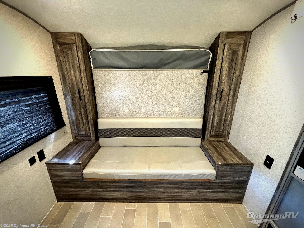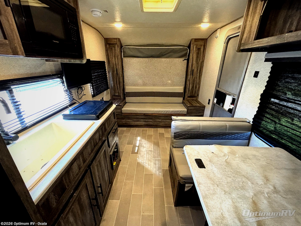 You can decide to leave for the weekend, easily hitch up and load up, and take off! Then enjoy the great outdoors with a 12' full-length power awning with adjustable legs, and the pass-through storage is where you will get your camping chairs, charcoal, and such. The USB charging outlets will keep your electronics running, and the queen Murphy bed will give you a good night's rest after a fun day hiking, biking, or relaxing at your campsite. You will find a rear full bathroom offering a linen closet on top of all the basics needed to get cleaned up before bedtime. And the booth dinette will provide extra sleeping space when you aren't playing games or eating your meal inside.