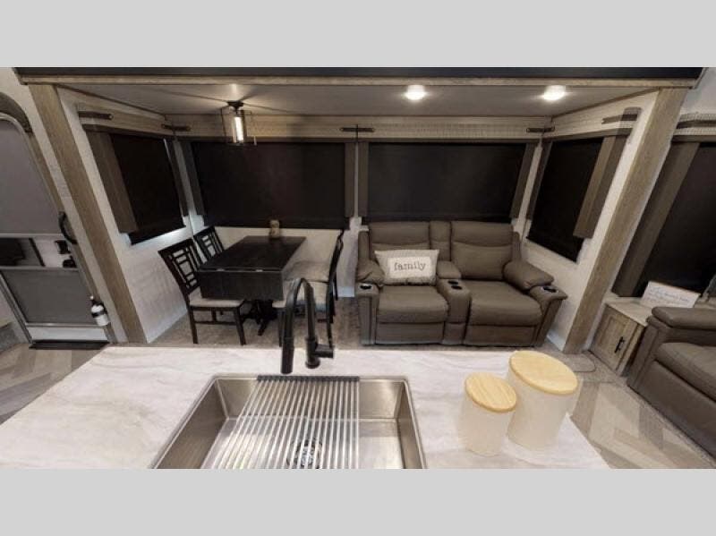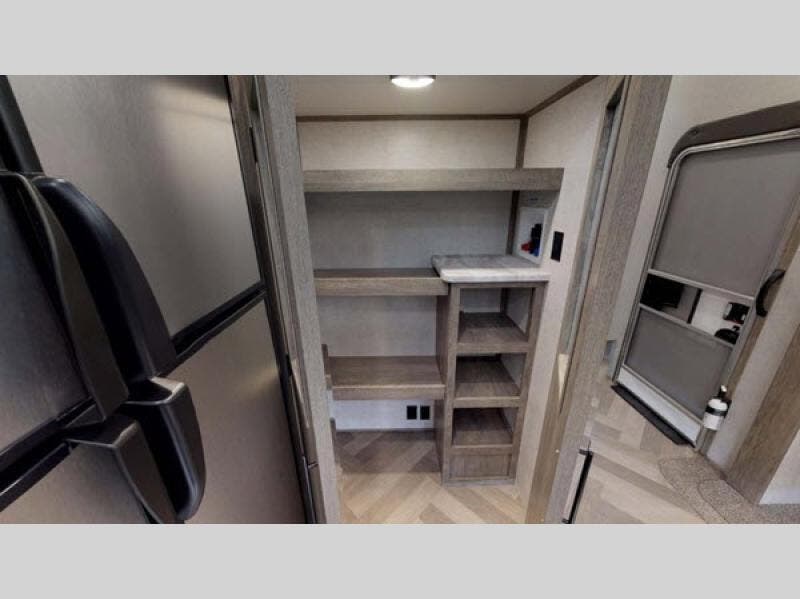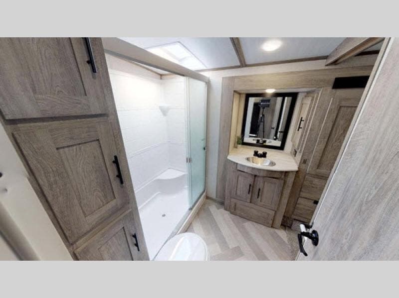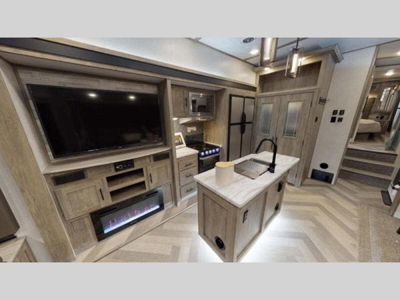 This fifth wheel is fit for a king! The front private bedroom features a custom king bed with wardrobes on either side, a slide out wardrobe, and a private entrance into the dual entry bath. Inside the bathroom you will find a residential walk-in shower with a skylight above for added natural lighting as you get ready at the vanity sink. Next to the deluxe french door pantry there is an area prepped for the optional washer and dryer to be added. The kitchen island will make your meal prep and clean up easier than ever, and the free standing dinette has a panoramic window next to it for dinner with a view. What better way to wind down your nights than to relax on the either the rear tri-fold sofa or the theatre seating while watching your favorite movie on the 50" LED TV above the 32" glass front electric fireplace!