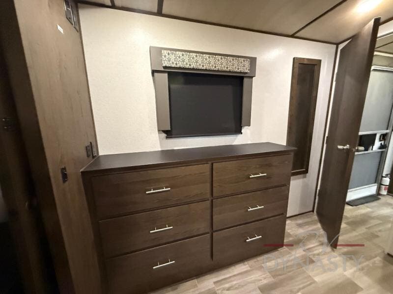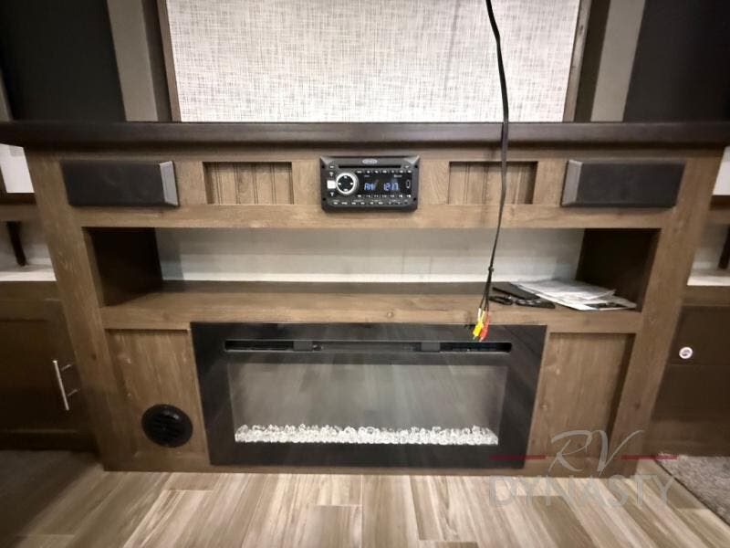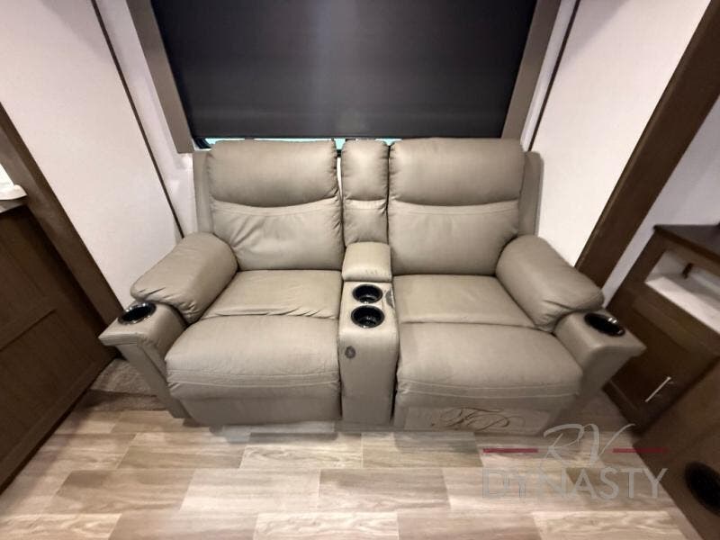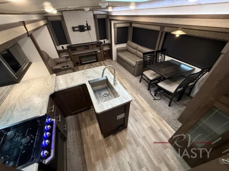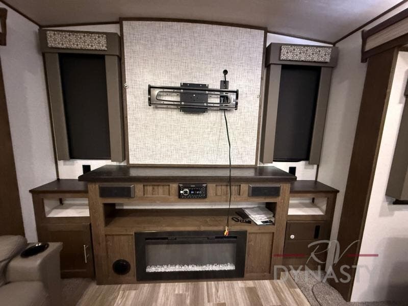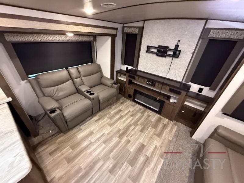 Are you ready to make plenty of memories with your family? Just imagine triple slide outs offering plenty of floor space in the main living and kitchen area, plus in the master bedroom. Along the rear wall there is an entertainment center with an LED HDTV and fireplace below to watch while sitting on the tri-fold sofa or in the theater seats. You can easily visit with your family while whipping up your favorite meals in the full kitchen with plenty of counter space. In the front bedroom you will enjoy a custom king bed, nightstands, a dresser, and a large walk-in wardrobe with sliding doors. Take a look!