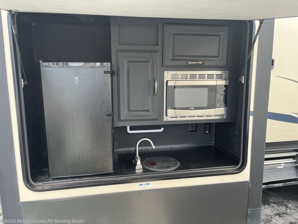 Get ready to camp in comfort when you choose to camp in this Sandpiper fifth wheel by Forest River. This model features sleeping space for up to six people with a rear queen bed and two tri-fold hide-a-bed sofas in the front living area. Along the front of this unit there is an entertainment center where you can watch a movie on rainy afternoons with the 50" LED HDTV as you snuggle up next to the fireplace. With two entry doors, you can easily enter this unit and be in the kitchen area, or you can enter through the rear door and have easy access to the bathroom. The exterior kitchen is ideal for storing drinks or snacks so that you can grab them quickly while you are playing outside with the kids.