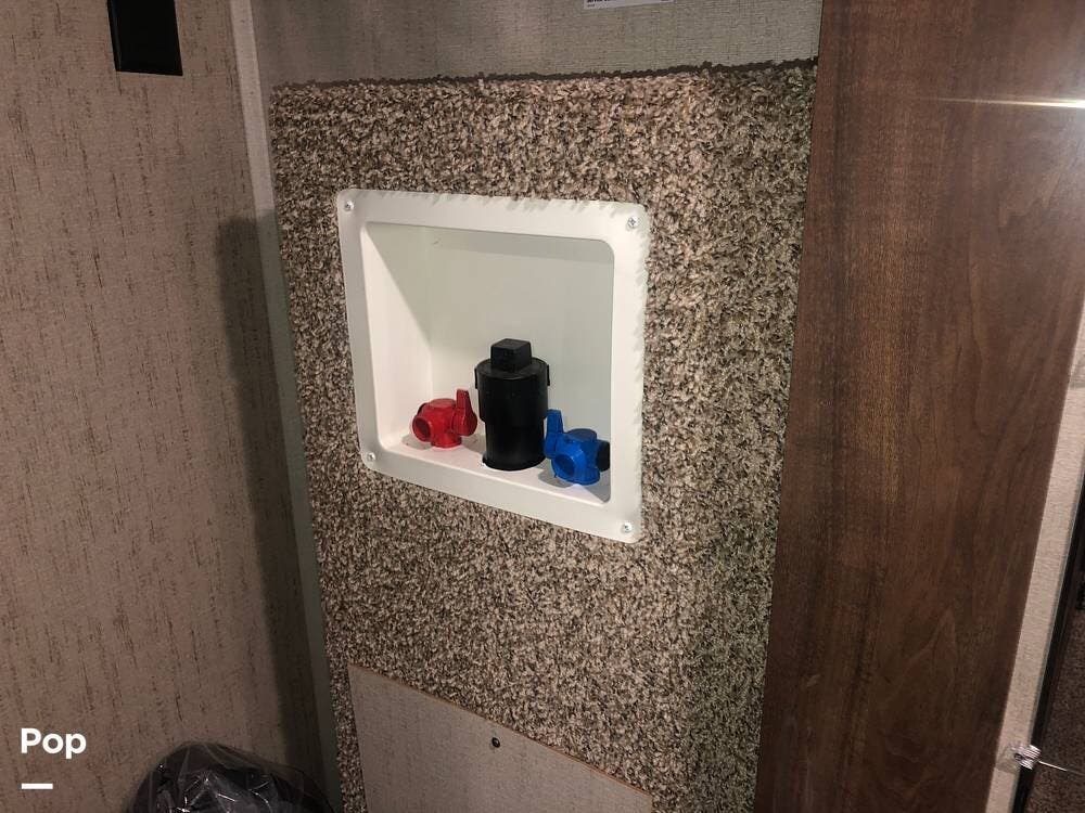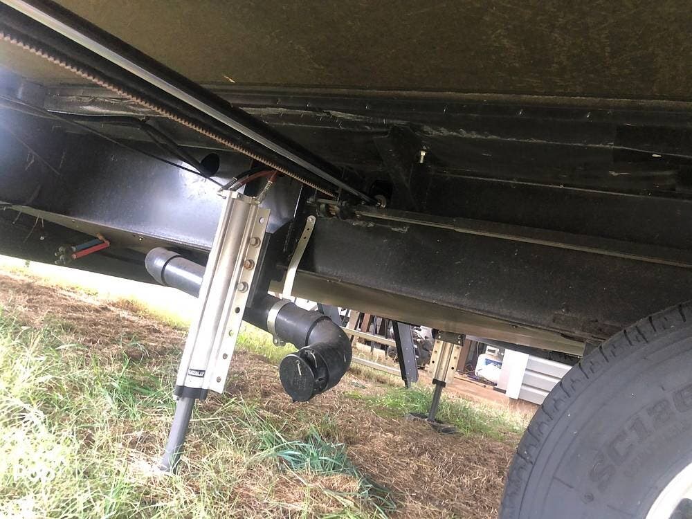 This fifth wheel has water filtration, heavy-duty steps at both entrances, a big awning, slide toppers, generator prep, washer/dryer prep, Central vac, rain sensor vents, and auto leveling!