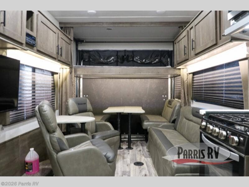 Step inside this Sandstorm toy hauler and experience a camping trip like none other! With 14' 4" of cargo space and 1,200 lb. tie downs mounted to steel, you can be sure your off-road toys will make it to your destination safely. There is plenty of room for everyone with the rear electric bed with a sofa below, two opposing sofas beside it, and a front private bedroom with a queen-size bed. Plus, you can switch out one of the sofas to add the optional chairs with table. The separated bath makes it easy for one person to clean the mud out of their ears while another washes up for dinner!