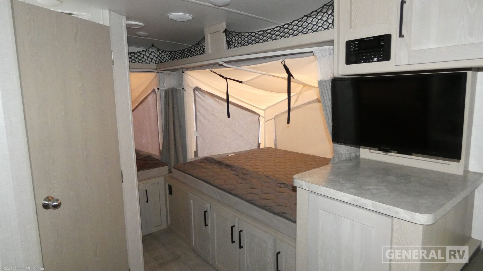 Forest River Shamrock 183 expandable highlights: Exterior Gas Griddle Exterior Storage Three Queen Tent Beds Entertainment Center Everyone will sleep soundly in this expandable with three tent beds! You have the option to cook indoors or outdoors with the three burner cooktop inside and the gas griddle outside. The 44" booth dinette is not only great for eating your meals at or playing some games, but also for transforming into an extra sleeping space for one if needed. After a fun-filled day outdoors, you can head to the rear corner bathroom and enjoy a relaxing, hot shower! Every one of these Forest River Shamrock expandables are built with a value that will make you jump! From the torsion axle, Rubber-Ryde suspension, the Nev-R-Adjust brakes, and the four frame mounted stabilizer jacks to the LED TV with a multi-directional antenna and the WiFi Ranger WiFi Booster Sky 4. You can travel anytime of year thanks to the outside antifreeze stations, the radiant foil insulated underbelly, and the ducted 35,000 BTU furnace. With the off road package, you can go off the beaten path with no worries.