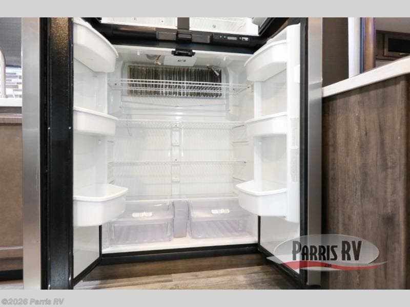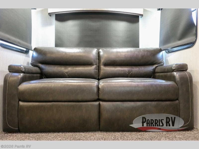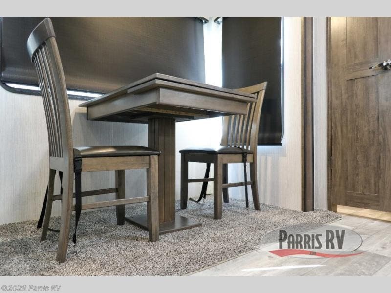 Wouldn't it be fun to travel to all-new destinations while still enjoying the many comforts that home provides? This Sierra fifth wheel will let you do just that! The front private bedroom is pretty cozy and convenient with its king bed slide, large wardrobe, and dresser. Since the bedroom is right next to the large bathroom that has a dual-sink vanity, you won't have to roam far when you need to get cleaned up in the walk-in shower with seat after waking up. Afterwards, head to the back of this unit where you will find a fabulous kitchen. This kitchen comes with great features, like the residential range with four burners, the residential refrigerator, the large pantry, and the free-standing table with chairs so that company can join you while you chop and fry.