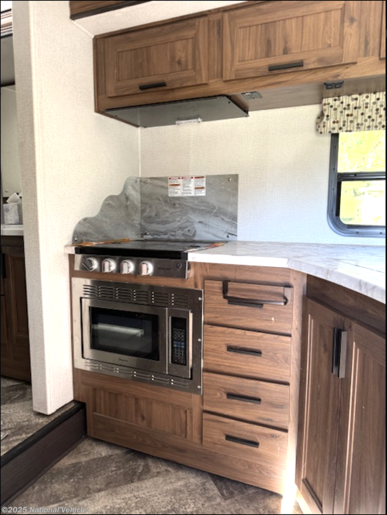 Powered by a V10 gas engine and carrying a 55?gallon fuel tank, it gives you the fuel range and power you?ll need for longer trips. Inside, the layout includes a rear private bedroom with a queen bed, a well?appointed kitchen with a 10.7 cu. ft. 12V refrigerator, full amenities like convection microwave and flip?up countertop space, plus a comfortable living area with dinette and a sofa. Generous water and waste tank capacities, an 18?foot power awning, and thoughtful extras like heated tanks, a 30,000 BTU furnace, and a 13,500 BTU roof AC make it suitable for varied climates.