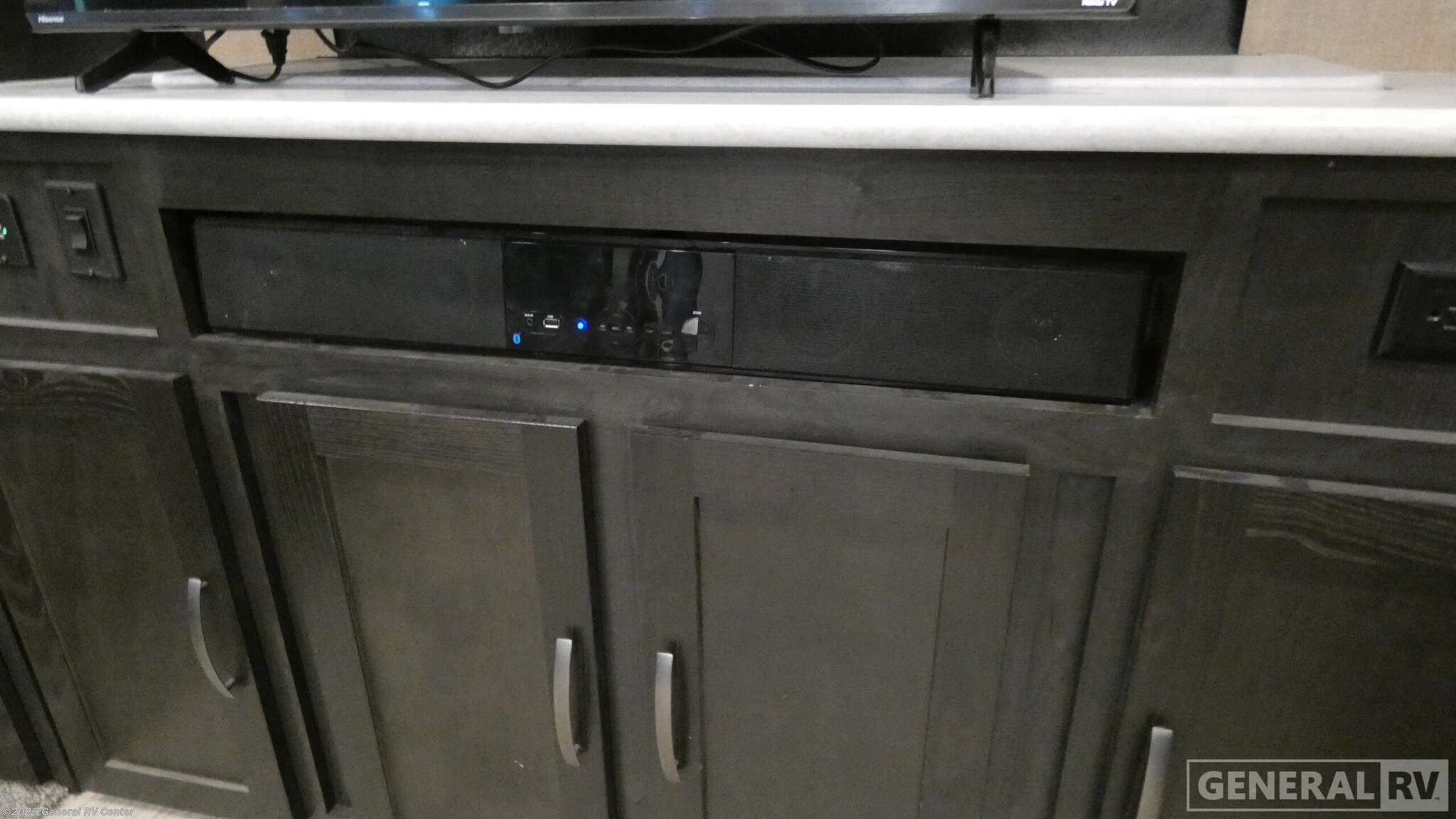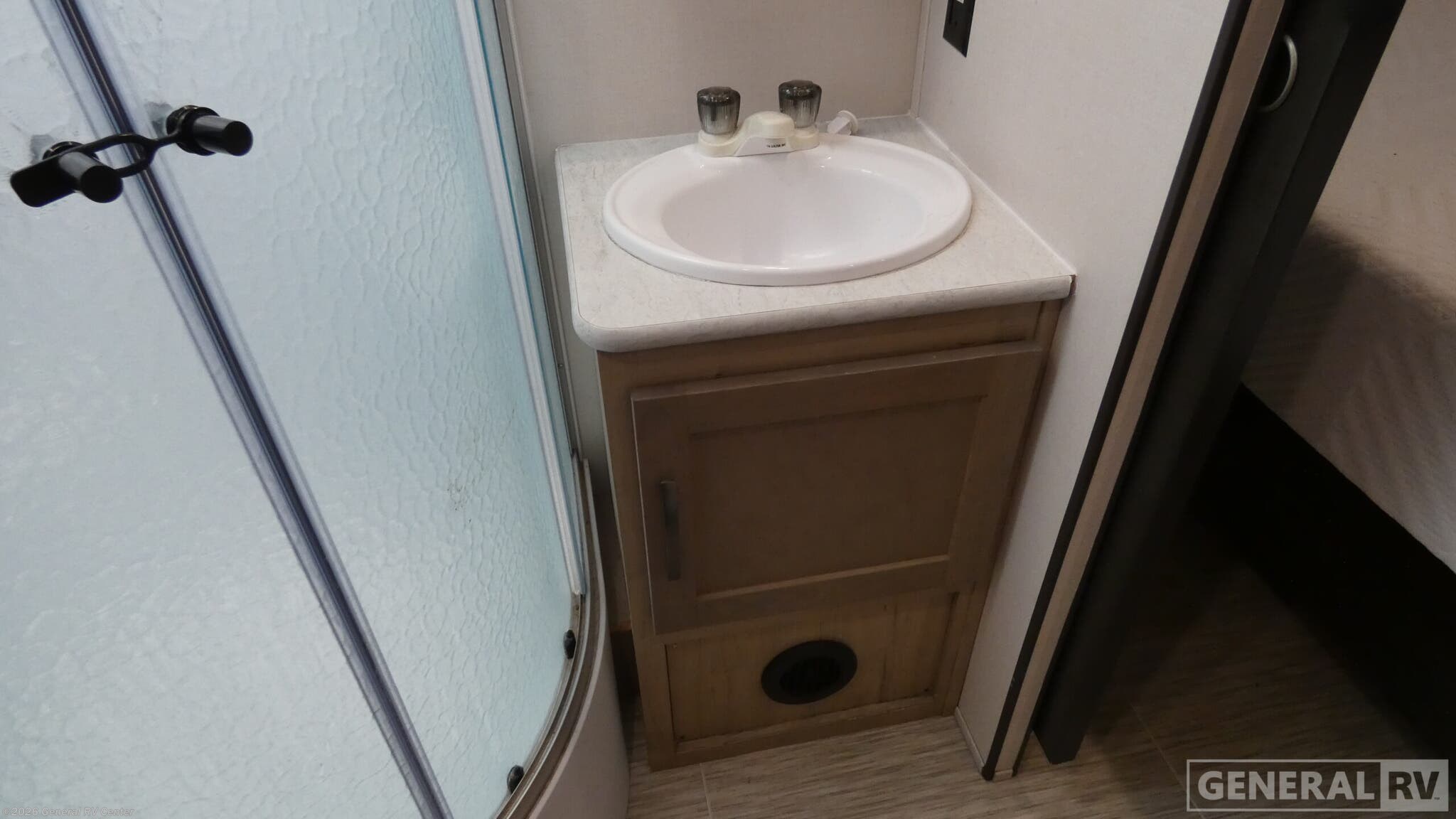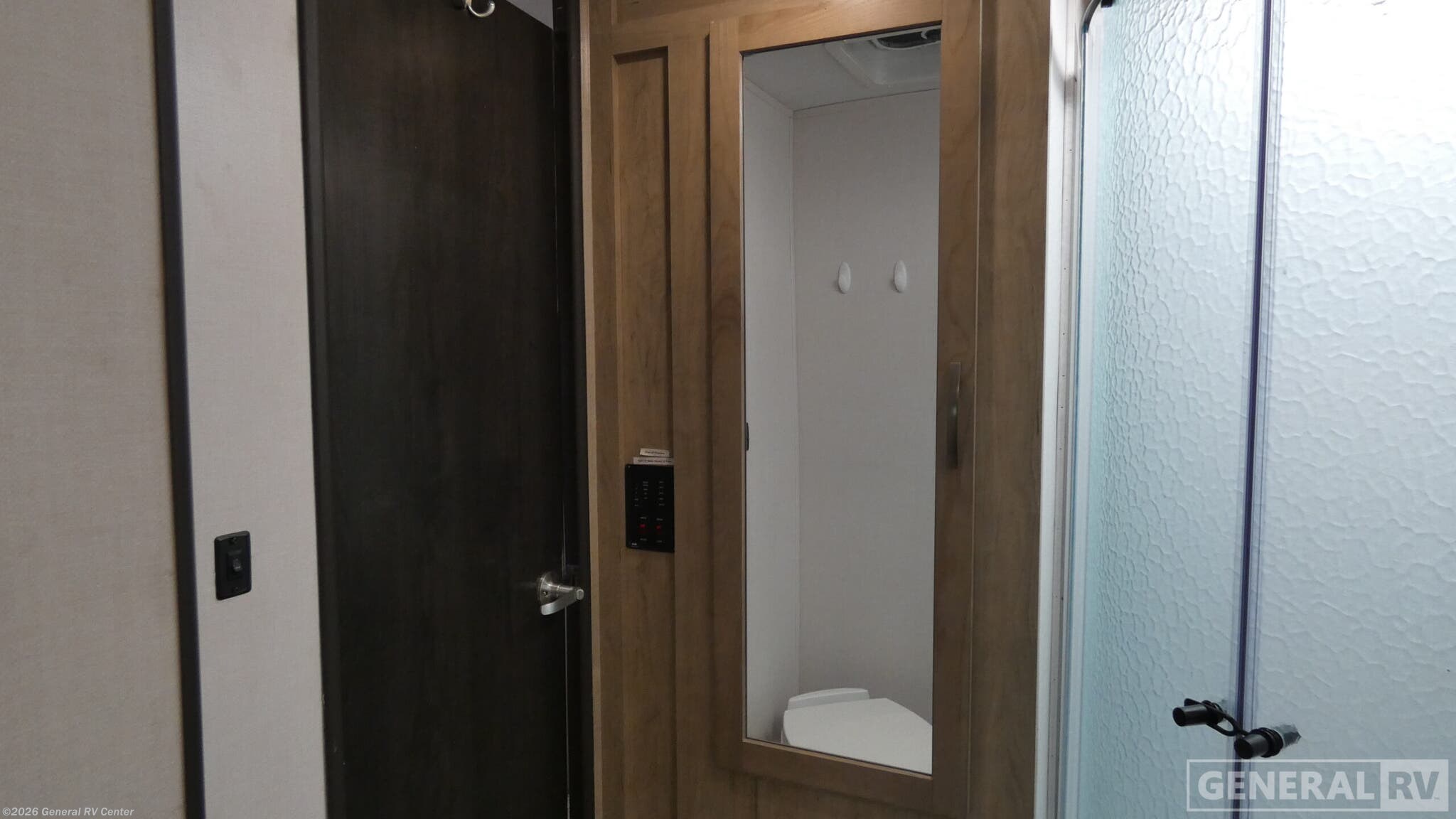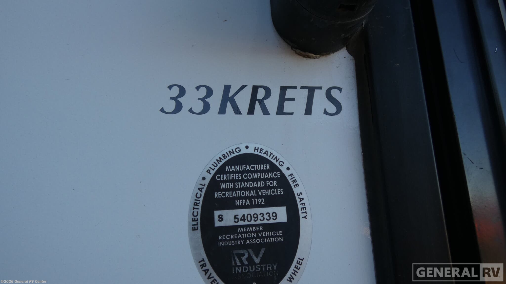 Forest River Surveyor Luxury travel trailer 33KRETS highlights: Stainless Steel Appliances Super Storage Center High Rise Kitchen Faucet Rear Entertainment Center LED Lighting When you are ready for a relaxing time away from home, choose this Surveyor 33KRETS travel trailer. You can comfortably spend time visiting with your family and friends in the rear living area on either the sofa or one of the two theater seats. Along the rear wall there is an entertainment center where you can watch movies or your favorite show on the 50" LED TV. The kitchen has a large counter peninsula with a double sink and a high rise goose neck faucet, plus a pantry that is big enough for you to bring along all of your favorite camping snacks. In the front private bedroom, you will find a king bed with a super storage center below and a large wardrobe along the front wall of the room with a bench, as well as a vanity across front the bed. Outside there is more storage with the pass-through storage area with LED lights, and a 20' electric awning with plenty of shade so now you can spend more time outdoors! For any camping trip you will want a Forest River Surveyor travel trailer. These models are lightweight and easy to tow, plus you will find that inside there is superior craftsmanship throughout. Along the interior there is a barreled ceiling which adds more headroom in each model and stainless steel appliances for an added at home feature. The designer Carefree flooring is stylish and easy to clean, plus there is a Furrion Bluetooth stereo for you to crank up the tunes. Along the exterior you will enjoy convenient features like the outside shower, the electric awning with LED lights, and the pet friendly utility hook with food bowls too. It is now easier than ever to choose a travel trailer that is ideal for you! What are you waiting for? Come select your Surveyor travel trailer today!