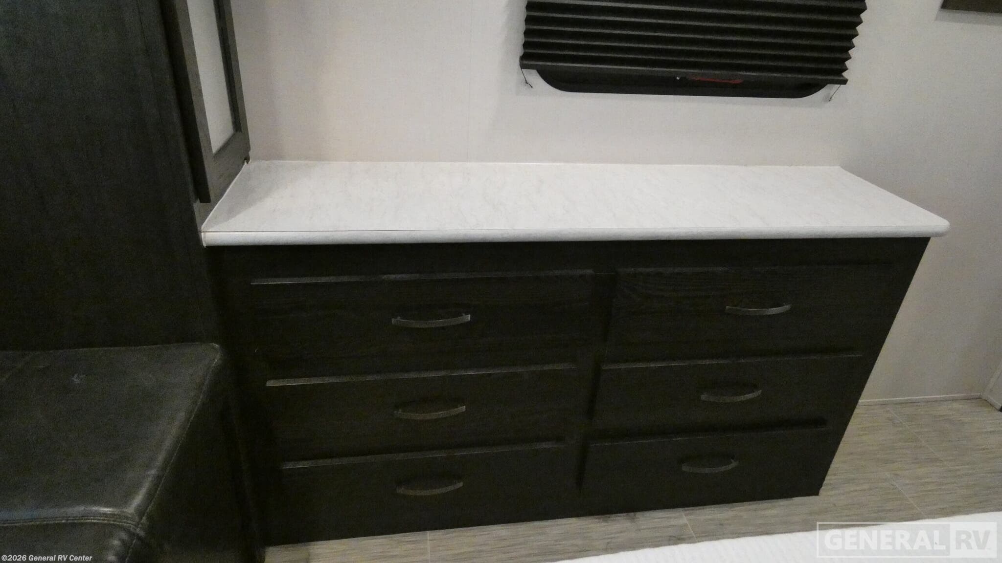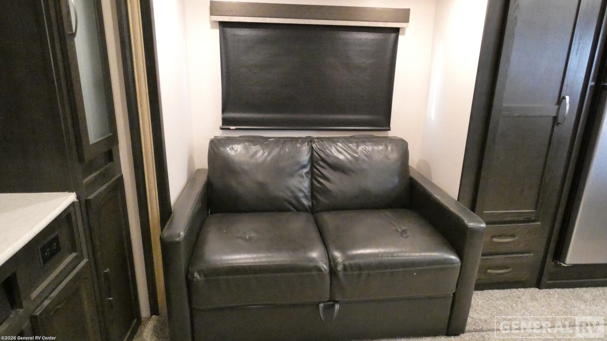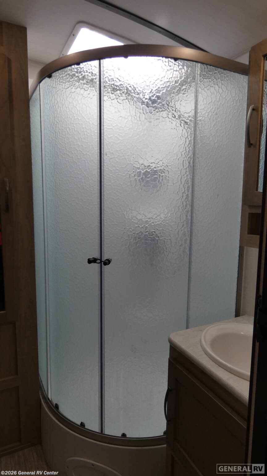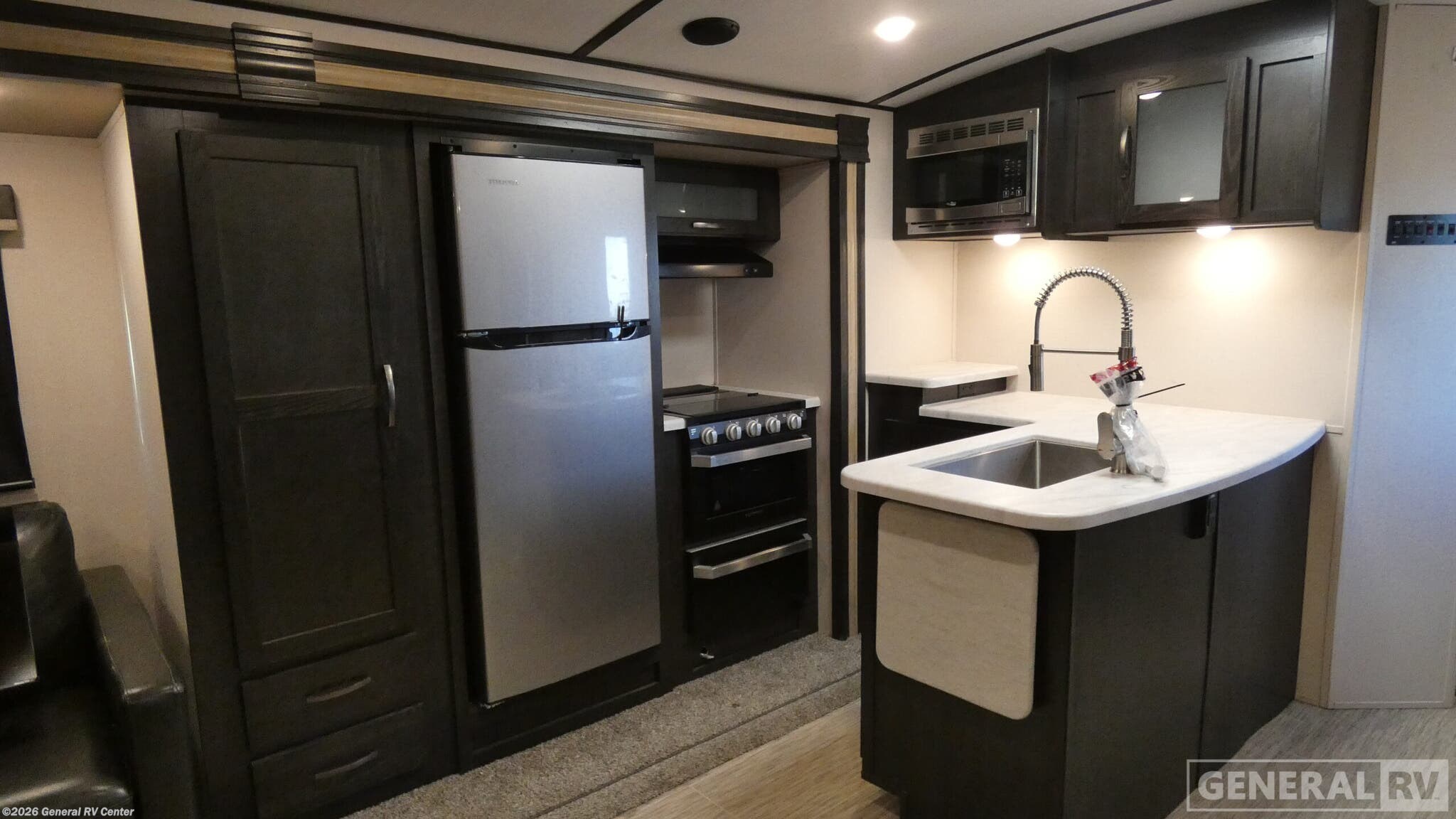 Forest River Surveyor Luxury travel trailer 33KRETS highlights: Stainless Steel Appliances Super Storage Center High Rise Kitchen Faucet Rear Entertainment Center LED Lighting When you are ready for a relaxing time away from home, choose this Surveyor 33KRETS travel trailer. You can comfortably spend time visiting with your family and friends in the rear living area on either the sofa or one of the two theater seats. Along the rear wall there is an entertainment center where you can watch movies or your favorite show on the 50" LED TV. The kitchen has a large counter peninsula with a double sink and a high rise goose neck faucet, plus a pantry that is big enough for you to bring along all of your favorite camping snacks. In the front private bedroom, you will find a king bed with a super storage center below and a large wardrobe along the front wall of the room with a bench, as well as a vanity across front the bed. Outside there is more storage with the pass-through storage area with LED lights, and a 20' electric awning with plenty of shade so now you can spend more time outdoors! For any camping trip you will want a Forest River Surveyor travel trailer. These models are lightweight and easy to tow, plus you will find that inside there is superior craftsmanship throughout. Along the interior there is a barreled ceiling which adds more headroom in each model and stainless steel appliances for an added at home feature. The designer Carefree flooring is stylish and easy to clean, plus there is a Furrion Bluetooth stereo for you to crank up the tunes. Along the exterior you will enjoy convenient features like the outside shower, the electric awning with LED lights, and the pet friendly utility hook with food bowls too. It is now easier than ever to choose a travel trailer that is ideal for you! What are you waiting for? Come select your Surveyor travel trailer today!