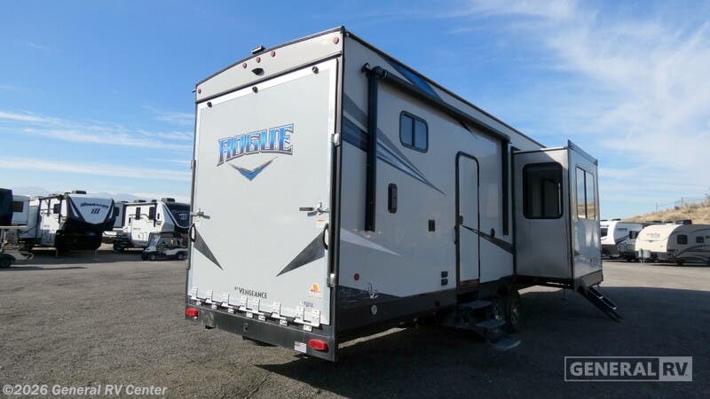Forest River Vengeance Rogue toy hauler 324A13WS highlights: Full and Half Bath 13' Separate Garage Master Suite Queen Loft Dual Entry Patio Door Whether you are looking for a weekend away or a month-long adventure, this Vengeance Rogue toy hauler will be just what you need to make every trip magical! The full and half bath are so convenient to have because they give you more space to get ready each morning, and the queen loft and quick-set queen bed system in the 13' separate garage provide a cozy spot for your guests or your kids. Spend your night in extreme comfort on the bed in the front master suite and head out to the kitchen to grab a late-night snack from the pantry if you get a little hungry. For any outdoor adventure, you will want a Vengeance Rogue toy hauler by Forest River! Each model features a ramp door patio system providing you an above-ground outdoor living space and a screen wall/tent wall to separate the inside from the outside without giving up any fresh air. With the enclosed underbelly, you can now camp in all types of weather, and after a day of playing outdoors, you will enjoy washing off the dirt at the outside shower. Inside, you will appreciate the multiple USB charging stations and the One Control system for lights, slides, monitor panel, and awning. Go Rogue today!