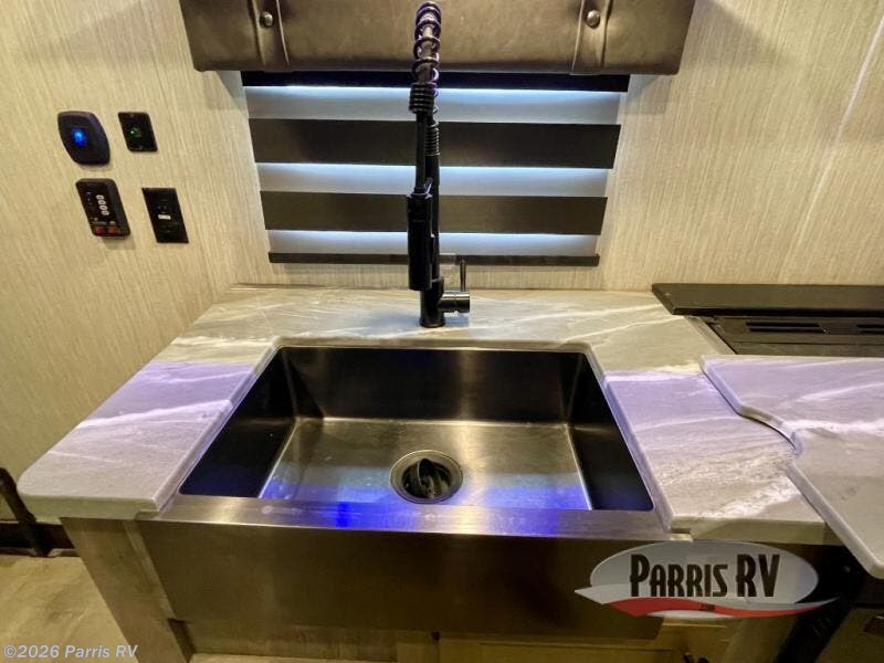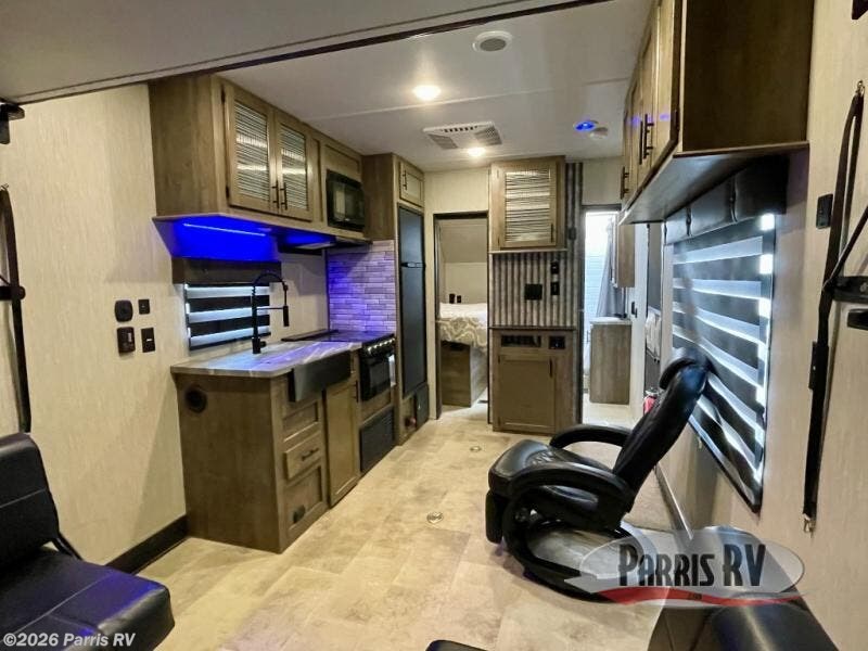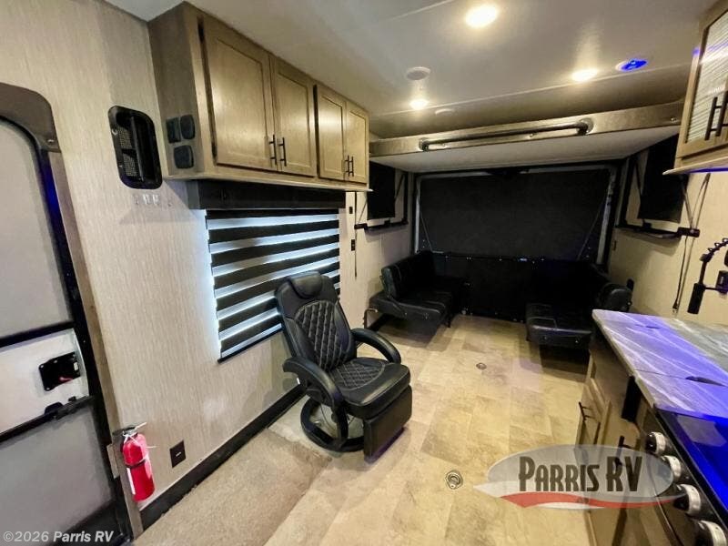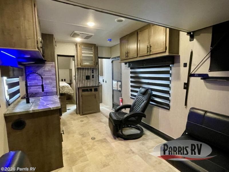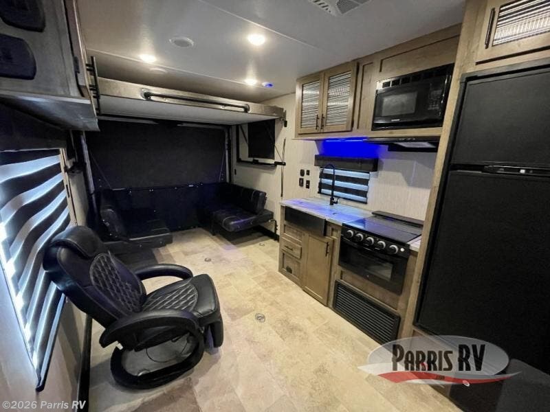 Do you want to experience a new way to travel? If so, grab this Vengeance Rogue toy hauler and hit the road! You will have all the amenities needed to enjoy weeks of fun, like a quick-set queen bed system in the back that will allow you to bring along friends and a king-size bed in the front private bedroom that will allow you to sleep comfortably. You'll have a full kitchen with a microwave, residential refrigerator, three-burner Furrion cooktop with oven, and residential farm sink. Plus, there are two lounge chairs right next to the kitchen so that your family can sit down and chat with you while you cook.