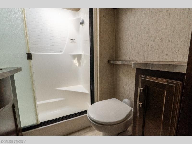 Gain momentum for your upcoming adventures by choosing this Momentum toy hauler to start the journey off right! The below-floor garage allows you to relax comfortably in the rear bedroom while your cargo is stored away underneath, and the bed lift extends the garage height to 6' 5" for tons of space. The dual-entry bath will come in handy at night so that you have easy access from the bedroom, and your guests can use the hallway entrance. Step down to the kitchen area where you'll find opposing slides for more space, a kitchen island with stools that the kids are sure to love, and plenty of storage with the pantry drawers, a hutch with a desk, and an additional pantry. After a day of riding the trails outside, you're going to love relaxing in the front living room which includes two tri-fold sofas, theater seating, and a telescoping TV with a fireplace below for all-around comfort.
