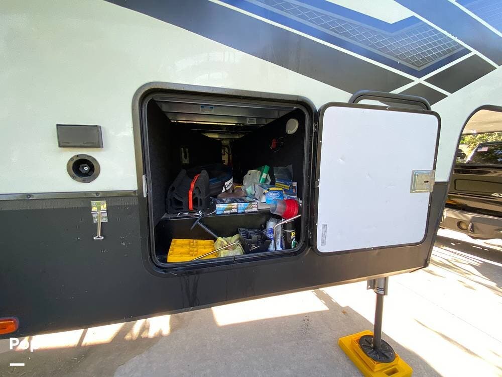 Take a look at this very well-maintained 2020 Momentum 381M fifth wheel toy hauler.