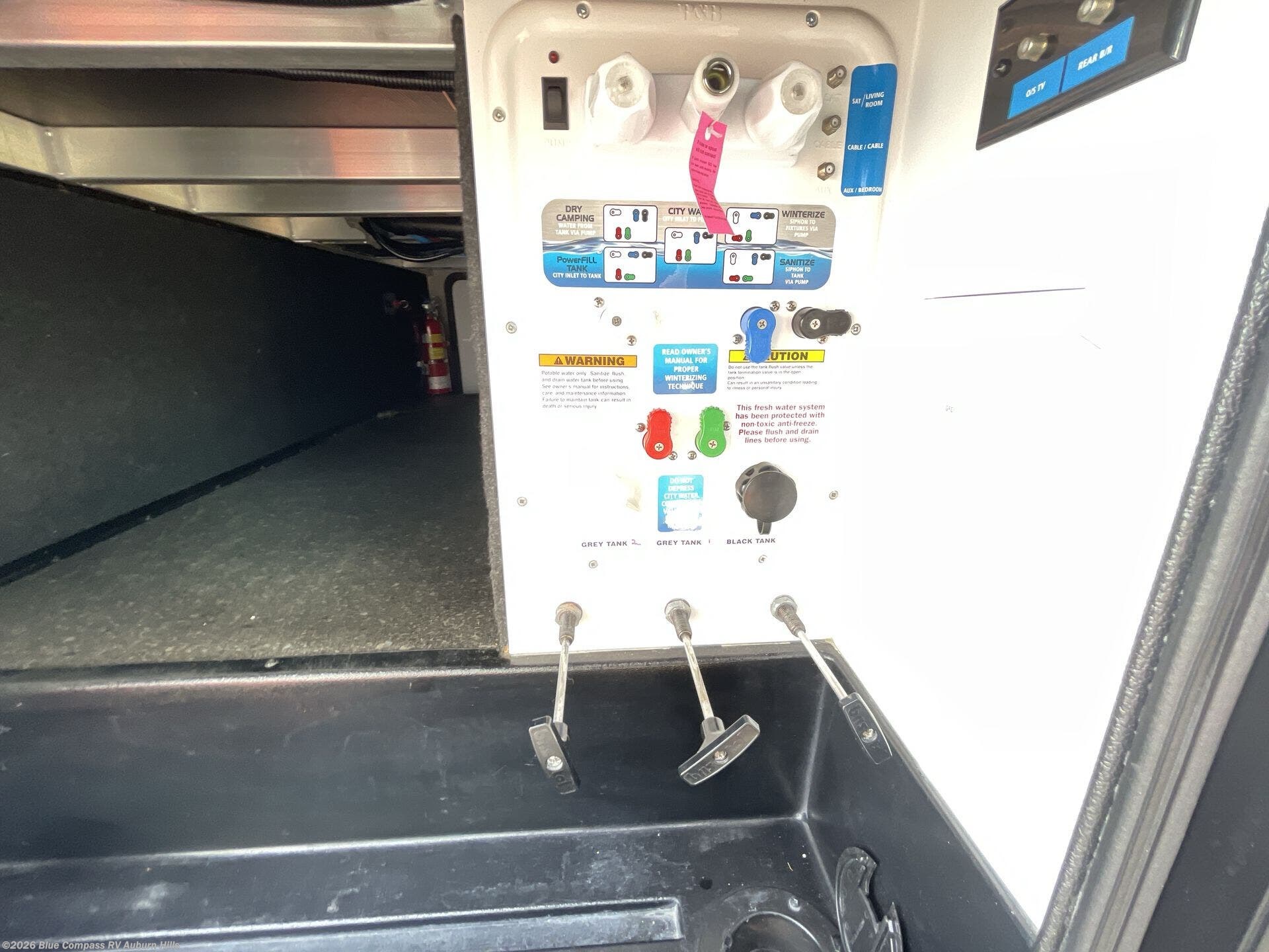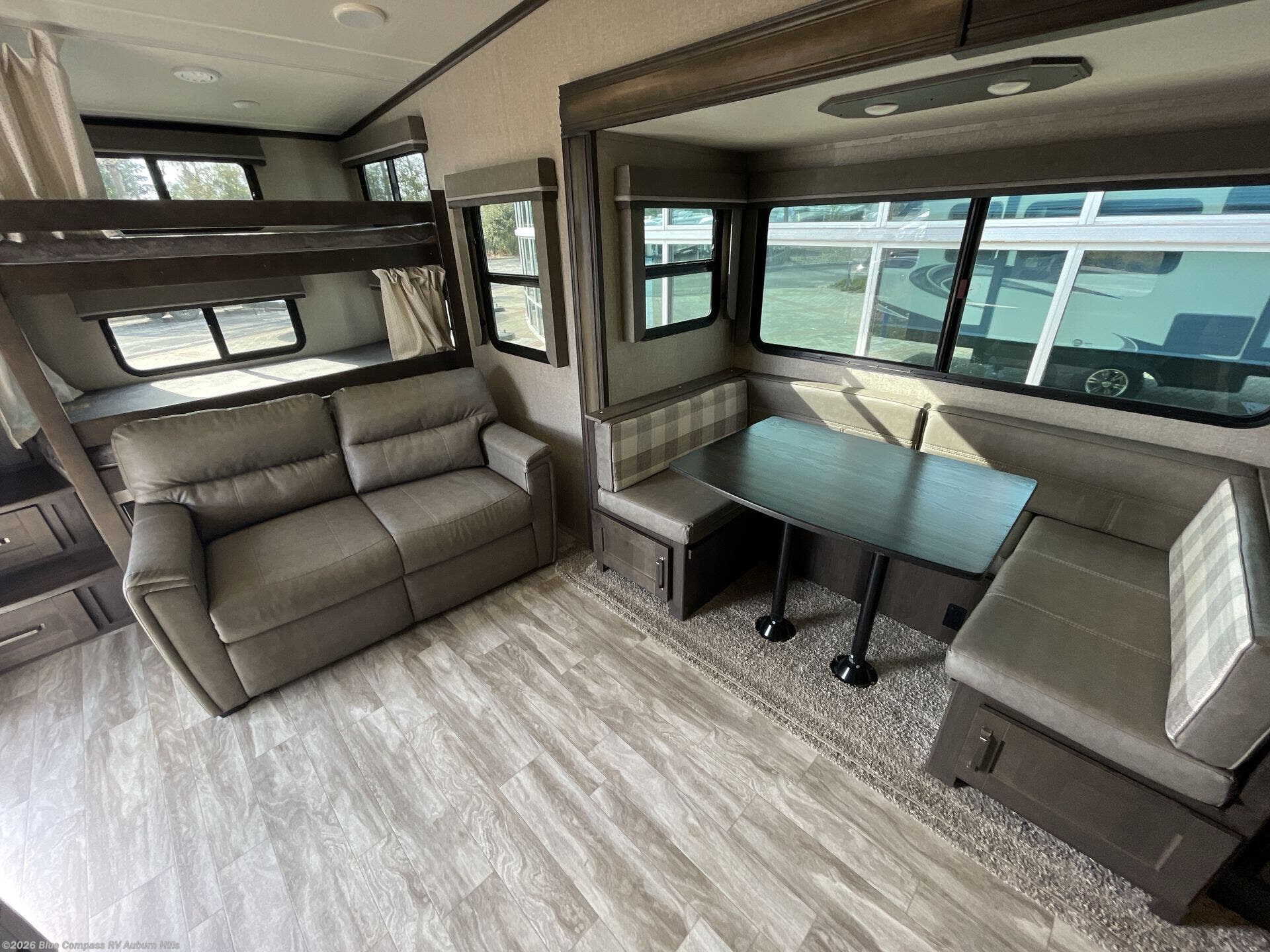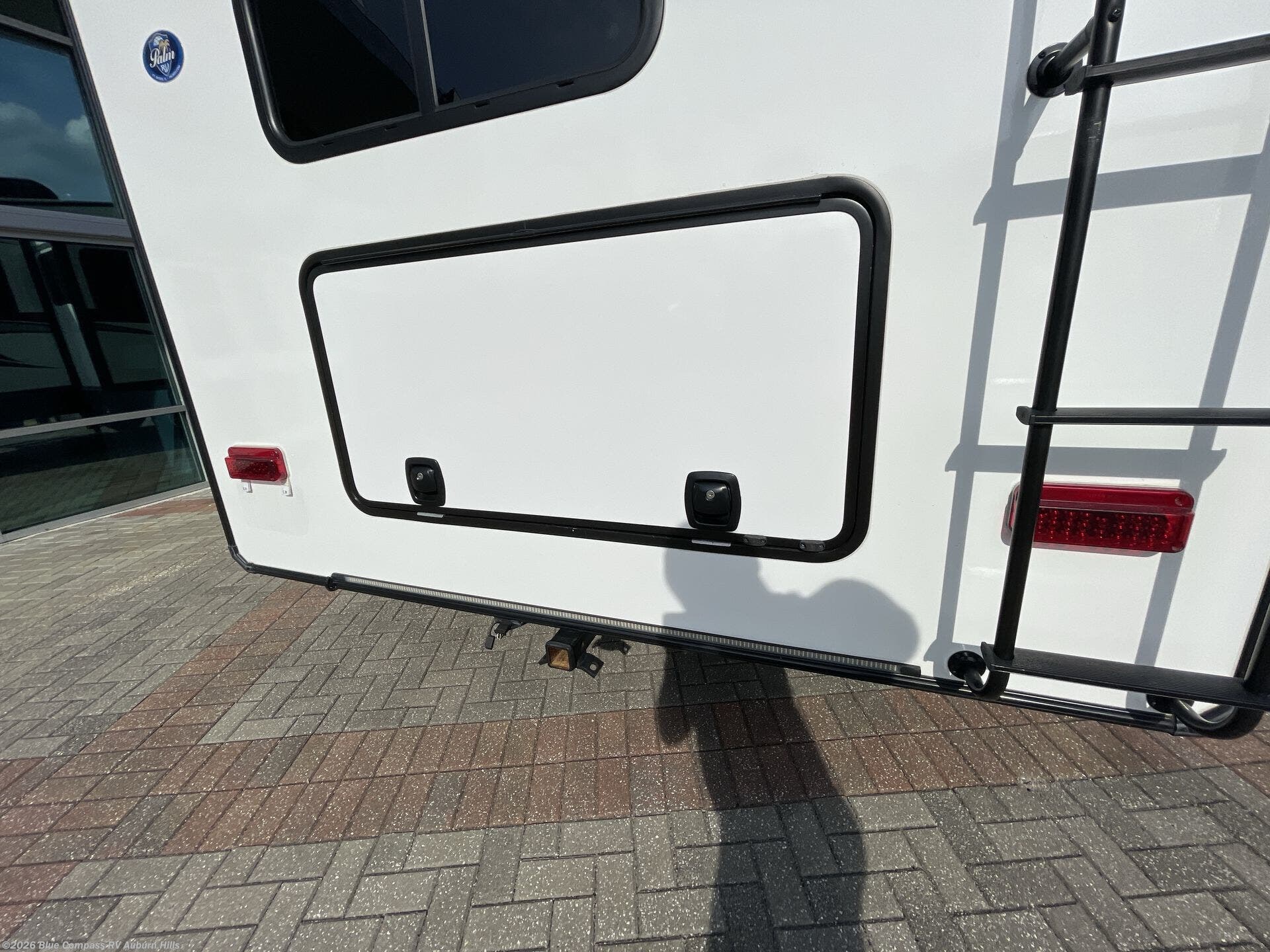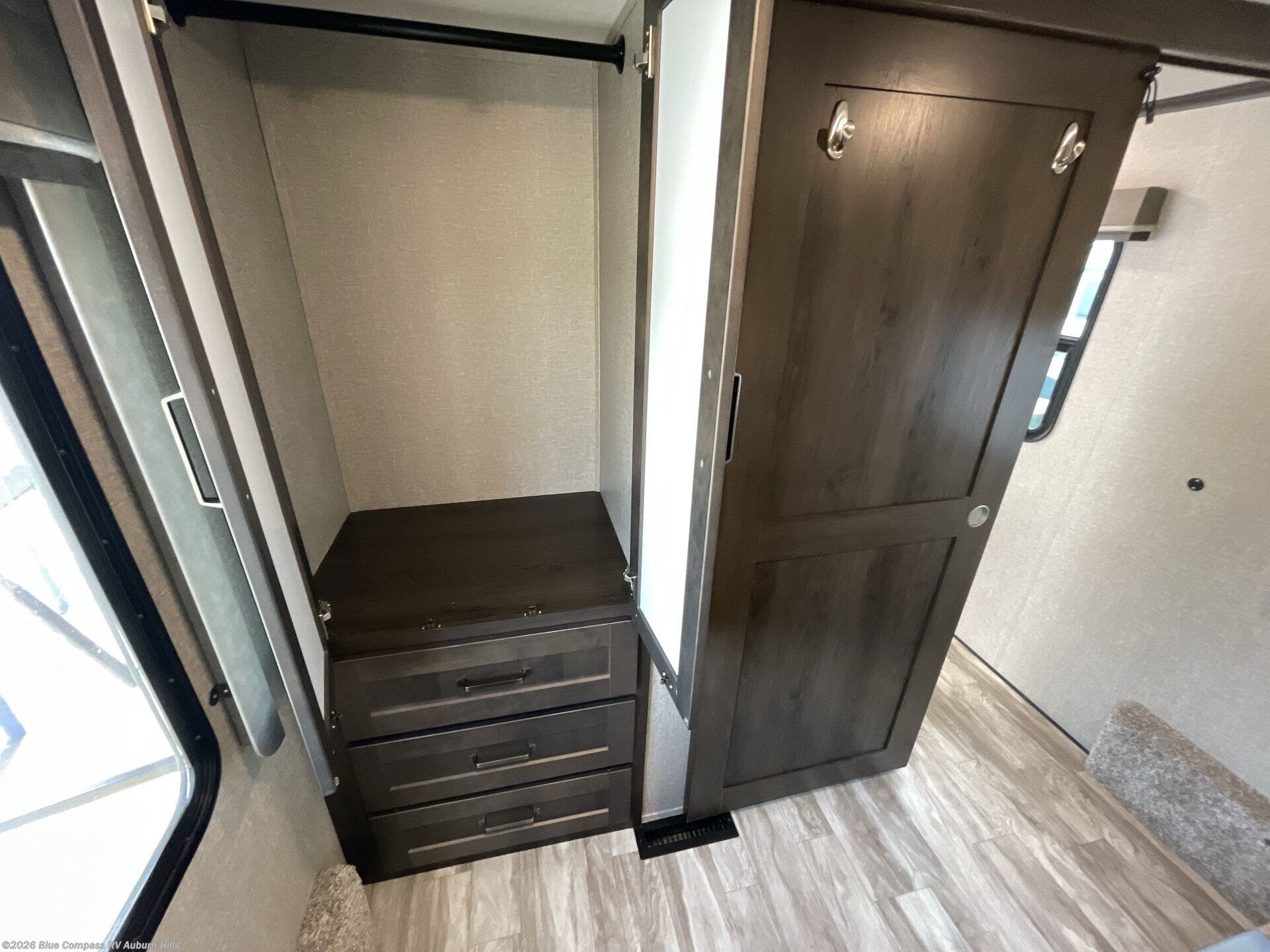 You will find plenty of storage for your clothing and such inside, plus outside the rear storage and unobstructed pass-through compartment will allow you to bring the outdoor games, camping chairs, charcoal, and fishing poles. The kids will love having their own bunk, a wardrobe and step storage, while you have your own space in the master bedroom with a walk-around queen bed and space saving sliding door. The main area is spacious with the slide out, and you can relax on the tri-fold sofa or choose the theatre seating option, and the U-shaped dinette offers plenty of space for playing games as well.