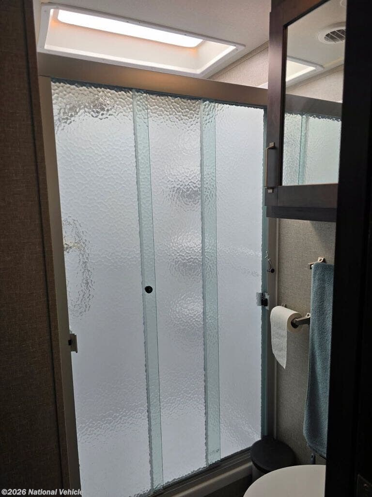 Shower With Sliding Glass Doors, Skylight, And Fan