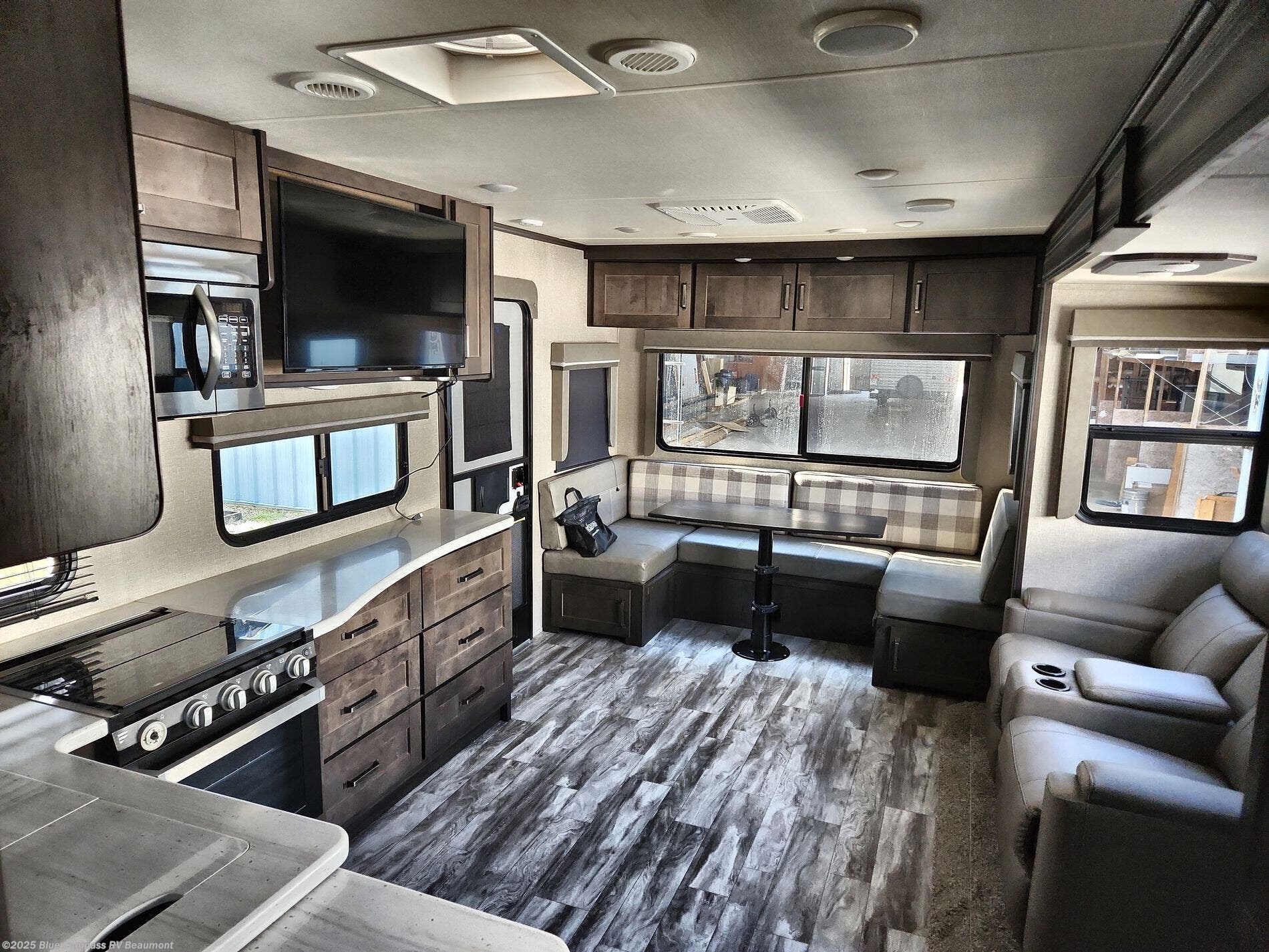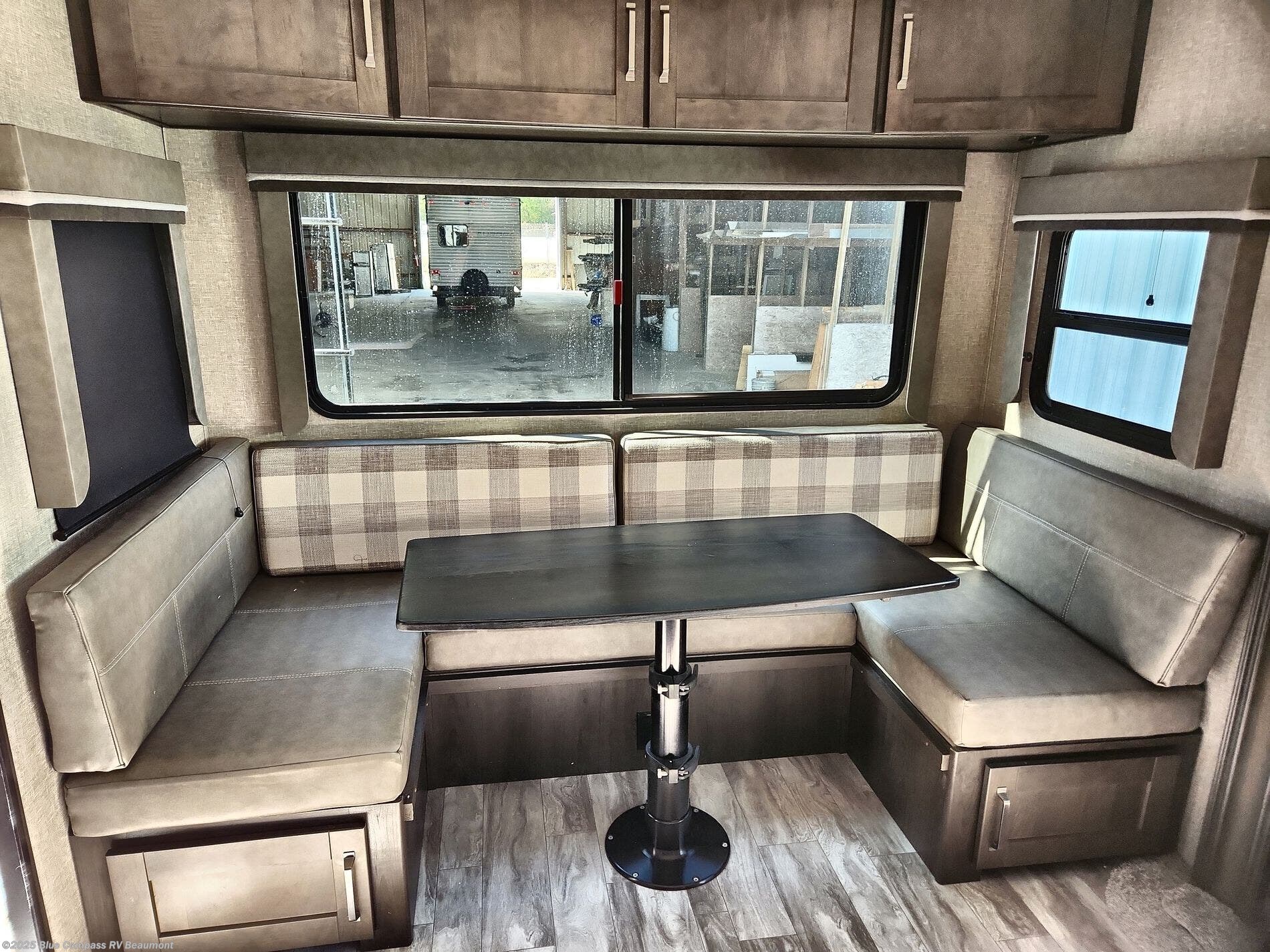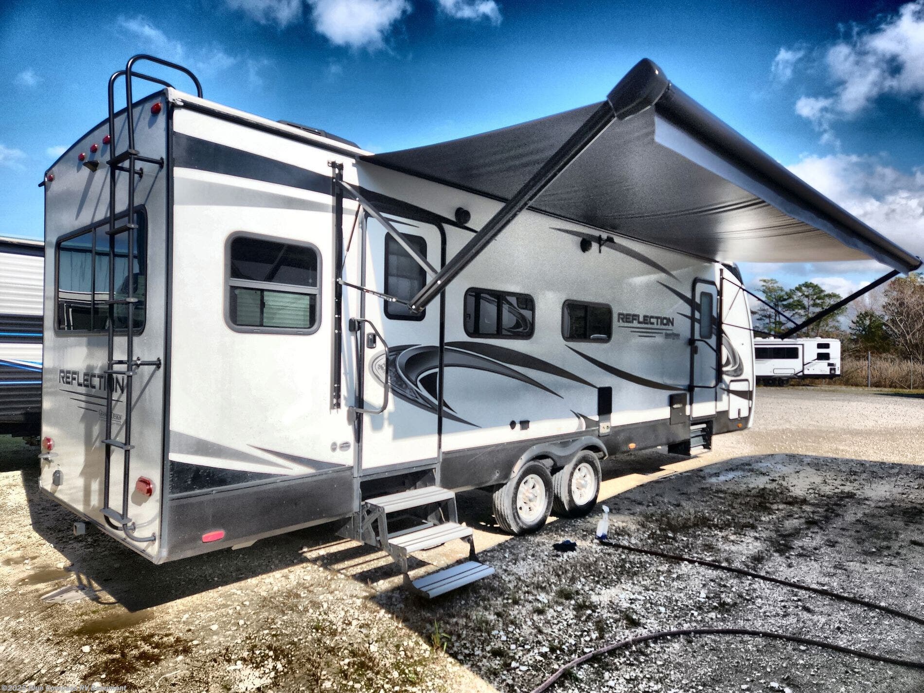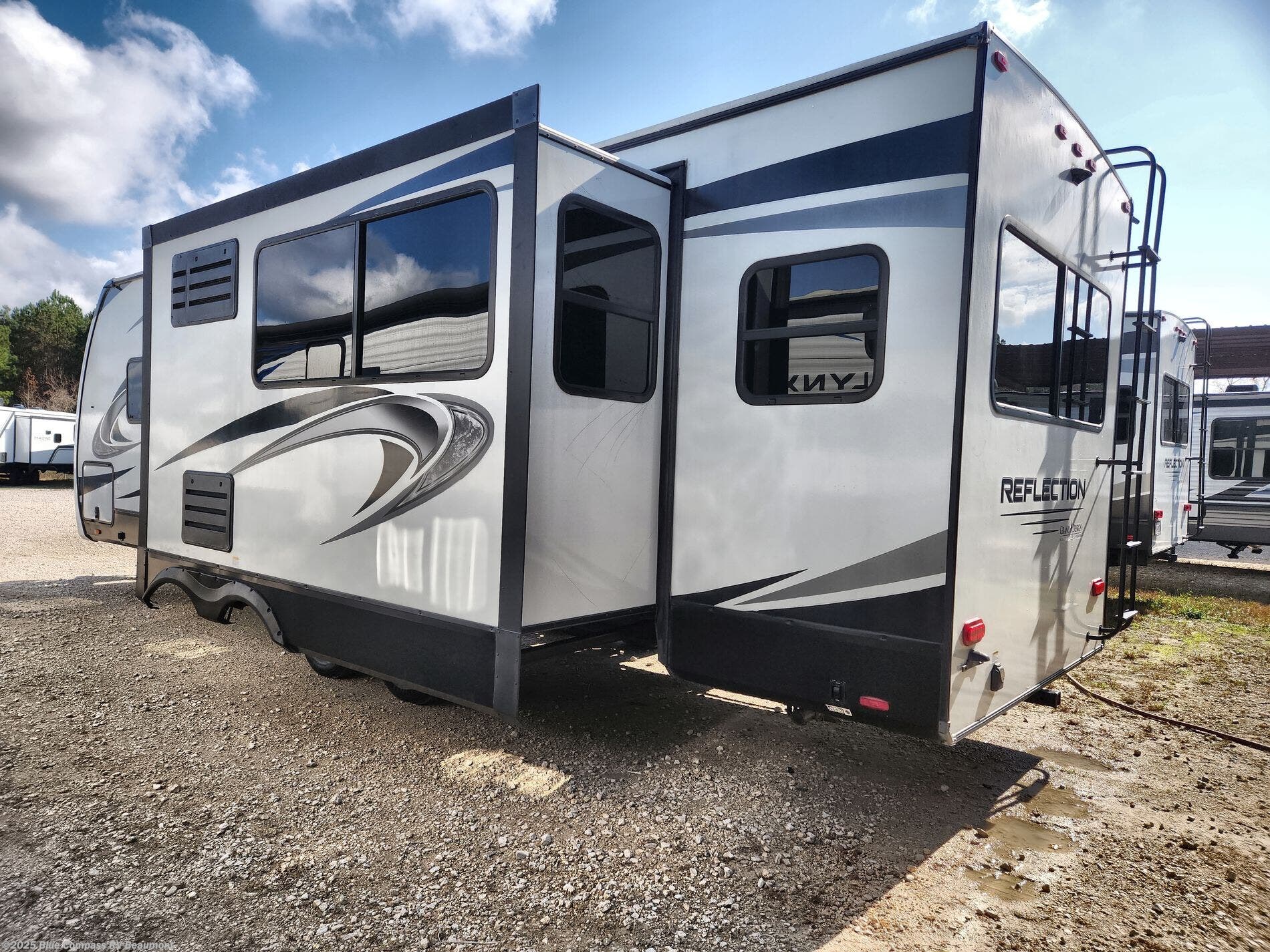 You will want to extend your camping trip with this Reflection travel trailer! Step inside and notice how the outdoors makes its way inside through the large panoramic windows surrounding the rear U-shaped dinette and above the slide out that contains a theatre seat, the 12 cu. ft. refrigerator and a pantry. The rear living area has plenty of seating so you can invite your camp neighbors over and enjoy the 40" LED swing arm TV. At night, a queen pillowtop mattress will be a welcome retreat for a great night's rest. You will find plenty of storage for your clothing and things with bedside shirt closets, a king size wardrobe with storage drawers, and more space for the clothing you hang. The underbed storage is also nice for larger items you wish to keep inside. When you wake each morning the full bath nearby will welcome you with a glimpse of the day ahead through the large shower skylight. And, when you are ready for your next adventure, head out through one of the two entry/exit doors.