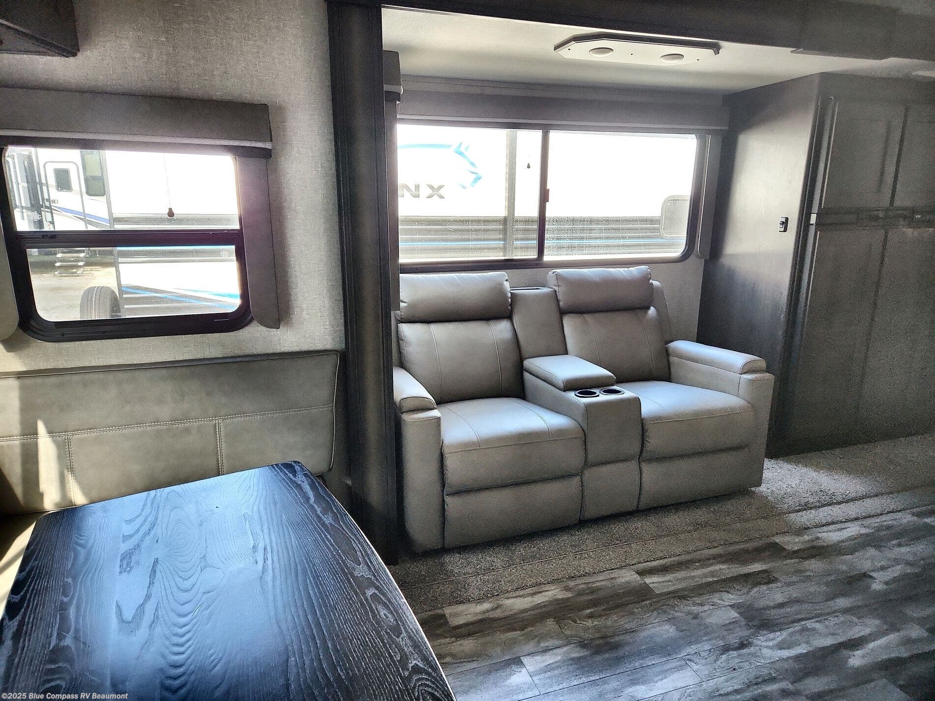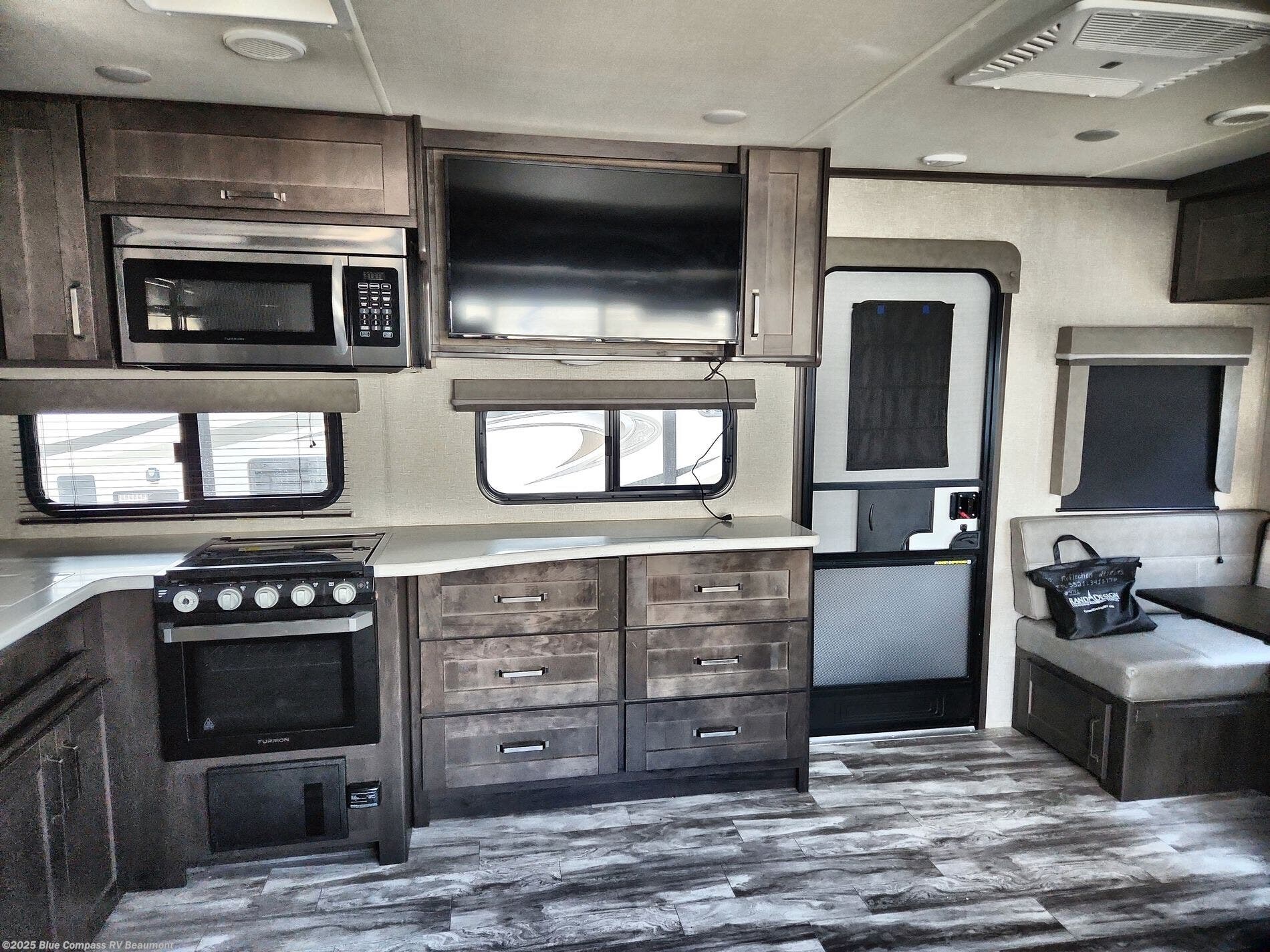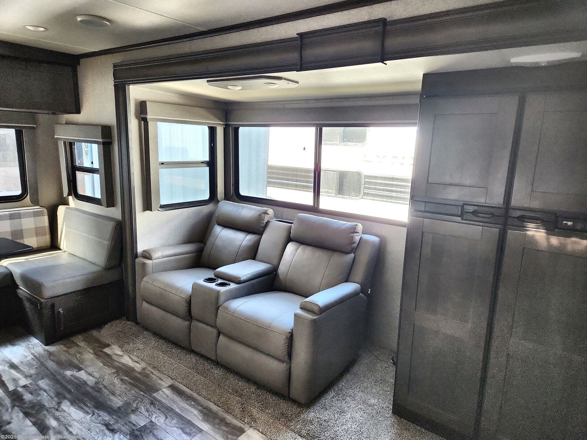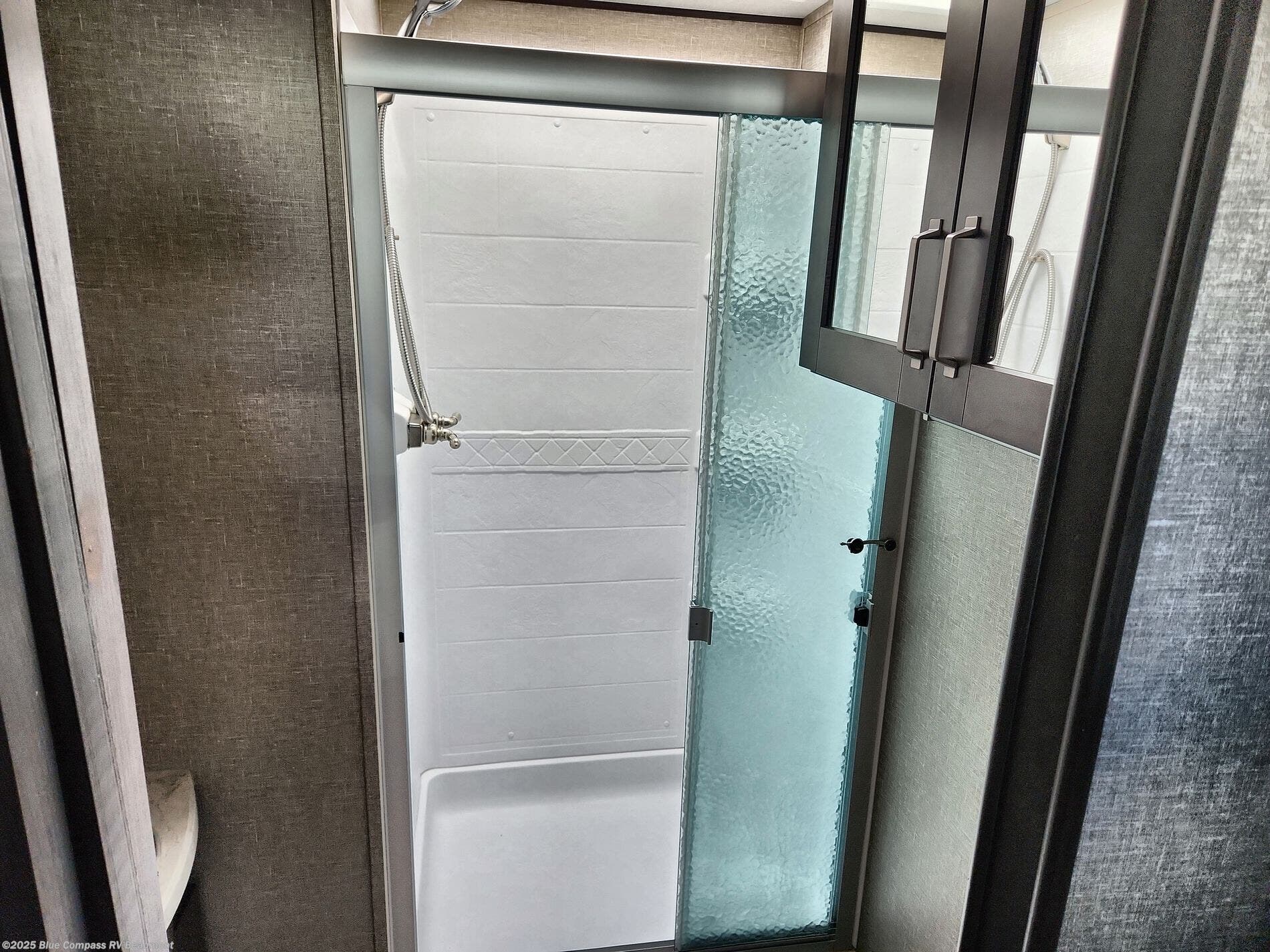 You will want to extend your camping trip with this Reflection travel trailer! Step inside and notice how the outdoors makes its way inside through the large panoramic windows surrounding the rear U-shaped dinette and above the slide out that contains a theatre seat, the 12 cu. ft. refrigerator and a pantry. The rear living area has plenty of seating so you can invite your camp neighbors over and enjoy the 40" LED swing arm TV. At night, a queen pillowtop mattress will be a welcome retreat for a great night's rest. You will find plenty of storage for your clothing and things with bedside shirt closets, a king size wardrobe with storage drawers, and more space for the clothing you hang. The underbed storage is also nice for larger items you wish to keep inside. When you wake each morning the full bath nearby will welcome you with a glimpse of the day ahead through the large shower skylight. And, when you are ready for your next adventure, head out through one of the two entry/exit doors.