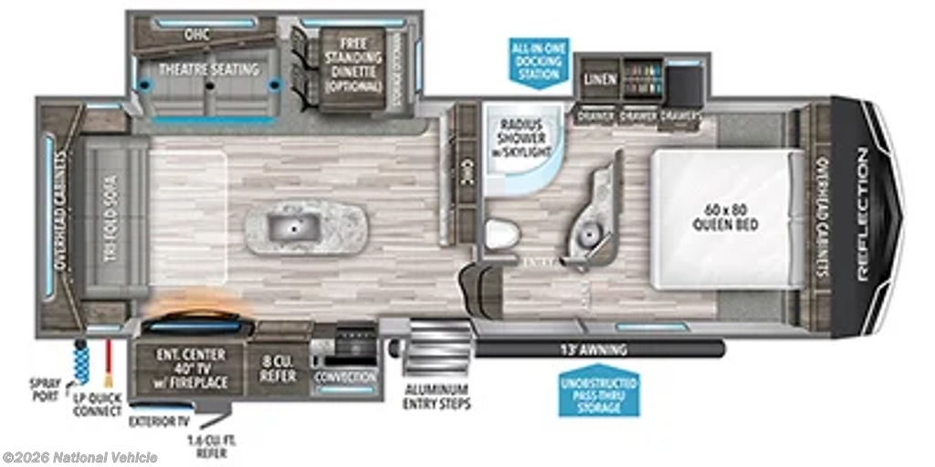 Outside, this Reflection keeps delivering with an outdoor fridge, outdoor shower, backup camera, and a receiver hitch. The Andersen hitch is included, making this a truly turn-key setup. With a base weight of 8,615 lbs and a hitch weight of 1,538 lbs, it tows confidently and comfortably.