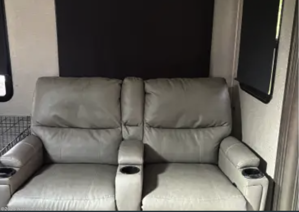 The spacious rear living layout offers a wide-open floorplan featuring dual opposing slides, theater seating, a large entertainment center, and a cozy electric fireplace?perfect for relaxing after a day of adventure. The fully equipped kitchen includes residential-style appliances, generous counter space, and ample storage.